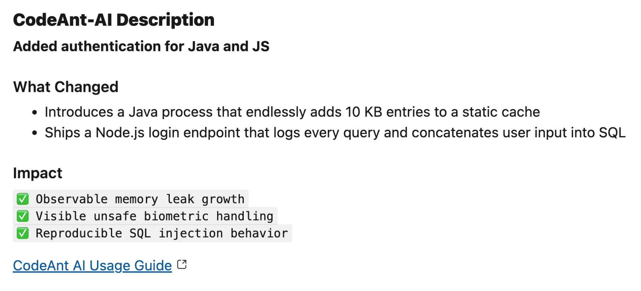 When a security tool reports “SQL injection on line 42,” developers spend significant time determining if it’s a real finding or a false positive. CodeAnt AI’s Steps of Reproduction shows the complete attack path: the exact malicious input an attacker would provide, how that input flows through your code (which functions it passes through, where sanitization is missing), what the exploit achieves (data exfiltration, privilege escalation, remote code execution), and exactly what to change to fix it. This is the difference between a rule ID that requires 30 minutes of investigation and a detailed proof that a developer can verify and fix in minutes. No other AI code review tool provides this level of security evidence.