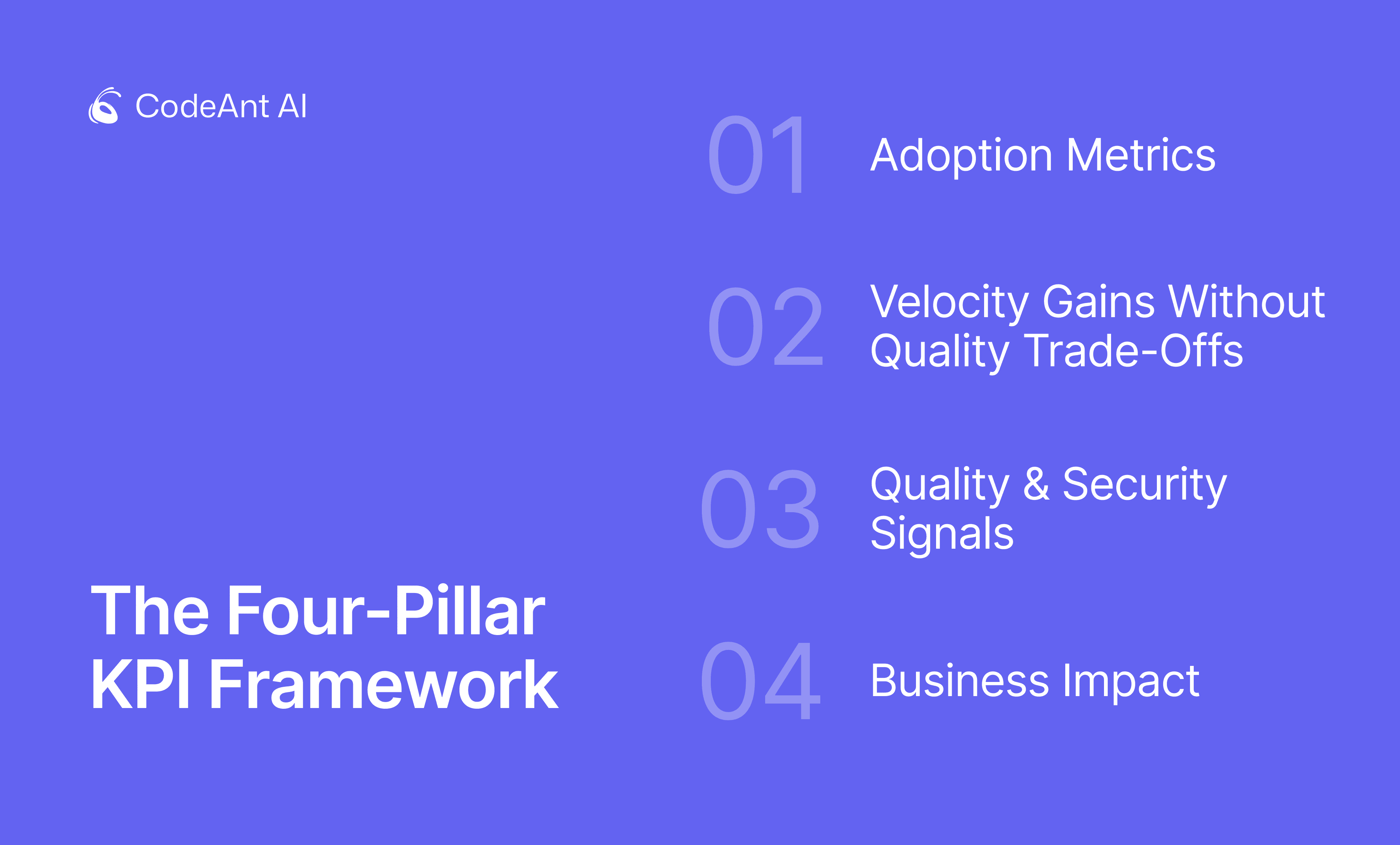 Measuring AI code review impact requires a layered approach that connects adoption signals to delivery outcomes. This framework organizes metrics into four pillars, each building on the last to give you a complete rollout picture without metric overload.