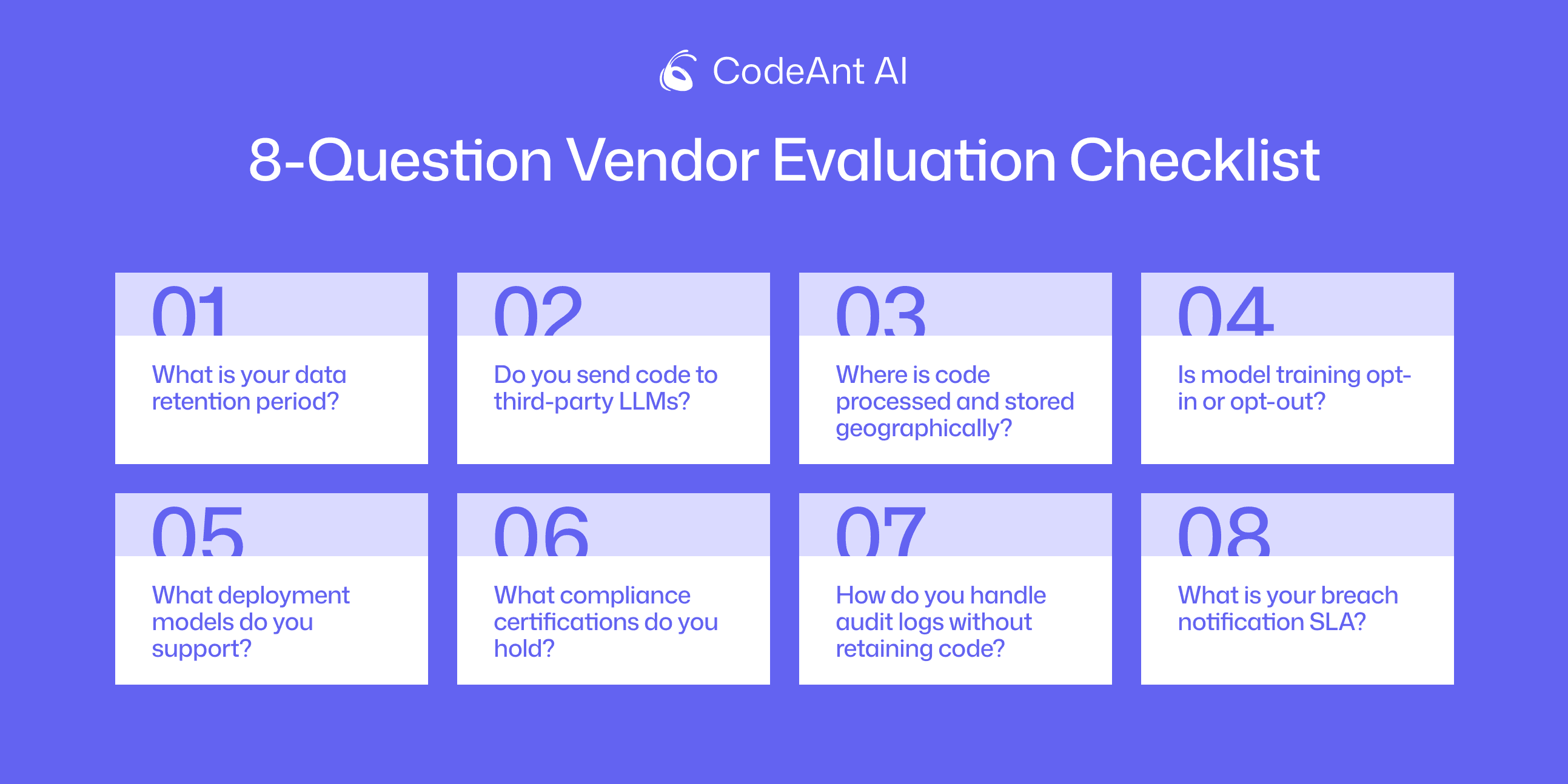 SOC 2, ISO 27001, and GDPR compliance are essential, but they verify that a vendor has controls in place, not that their architecture minimizes risk. A tool can be fully compliant while retaining code for 90 days, sending it to third-party LLMs, and storing it in cloud databases.