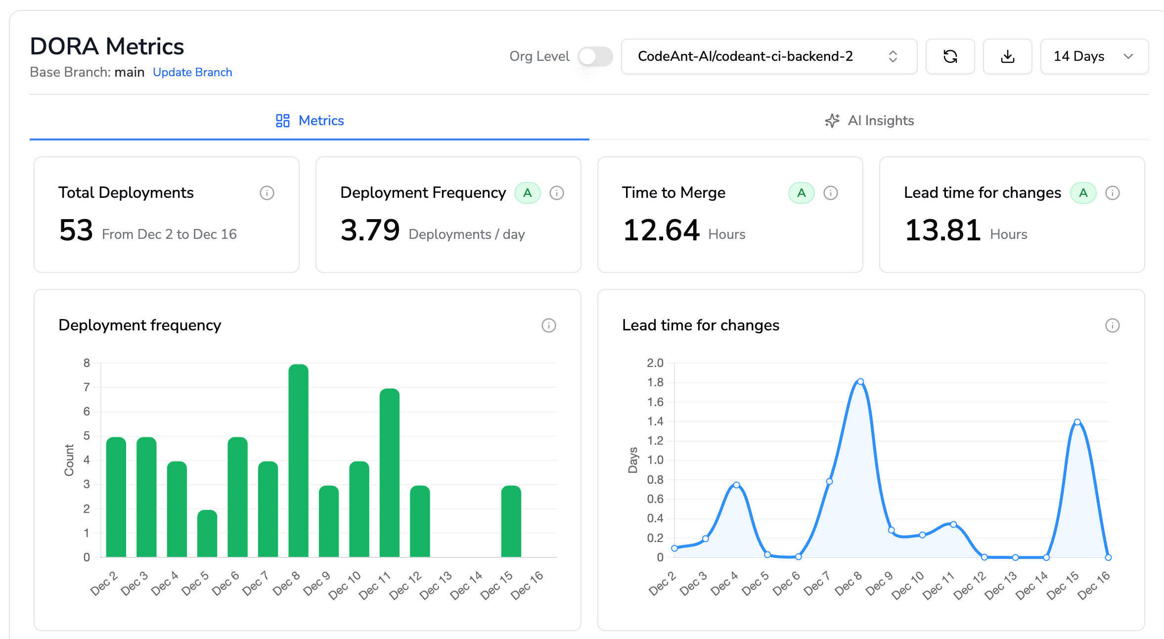 Scattered tooling creates blind spots. A unified dashboard tracking maintainability, coverage, and DORA metrics (deployment frequency, lead time, change failure rate) gives engineering leaders visibility across the entire codebase.