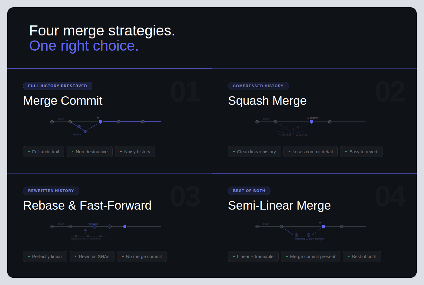 Merge type | Squash for features, merge commit for integration branches, locked down via policy |