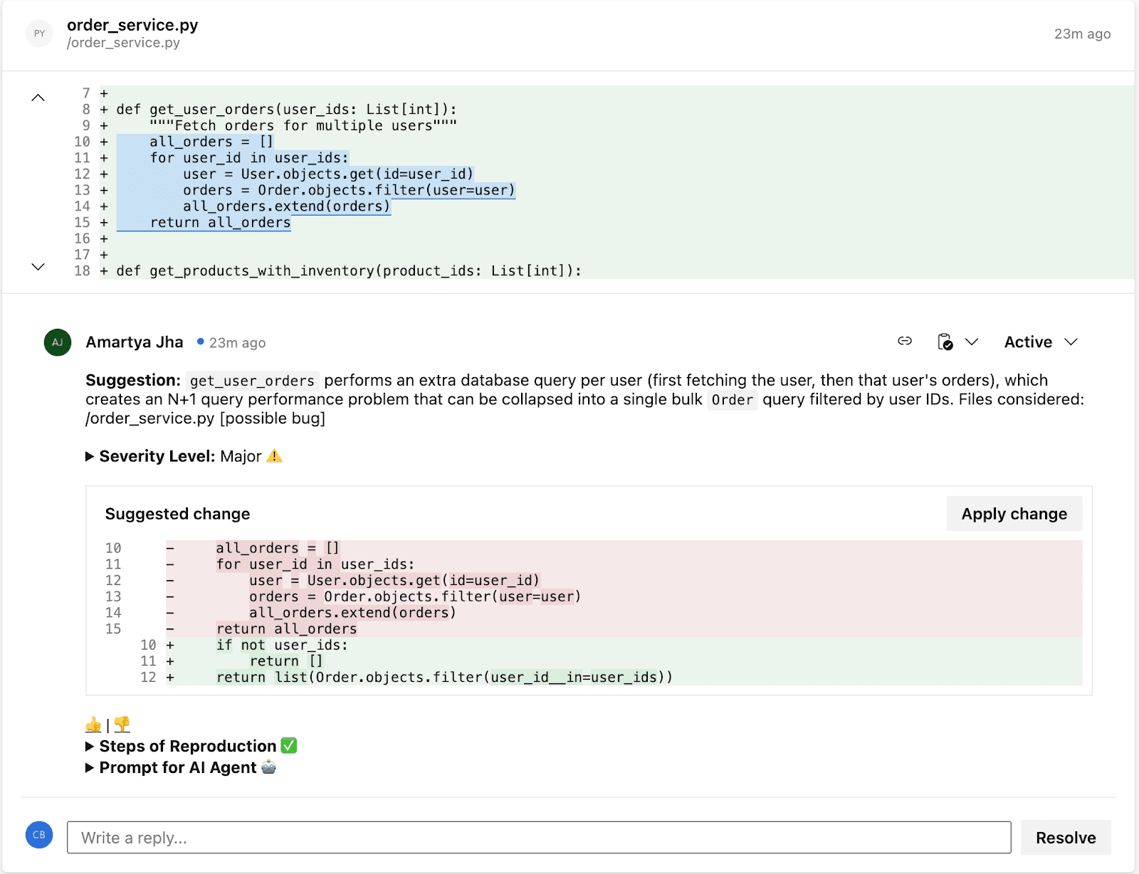 Write: “This query runs inside a loop, consider batching to avoid N+1. Here’s a pattern:
