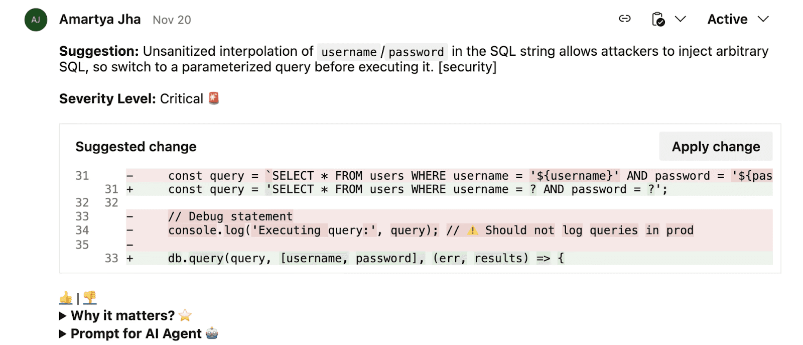 Pipeline-level scanning catches vulnerabilities at build time. PR-level scanning catches them earlier, when the developer is still reviewing the code change and can fix issues immediately. This is the difference between “your build failed, go check the dashboard” and “here is the exact issue on line 47 with a suggested fix.”