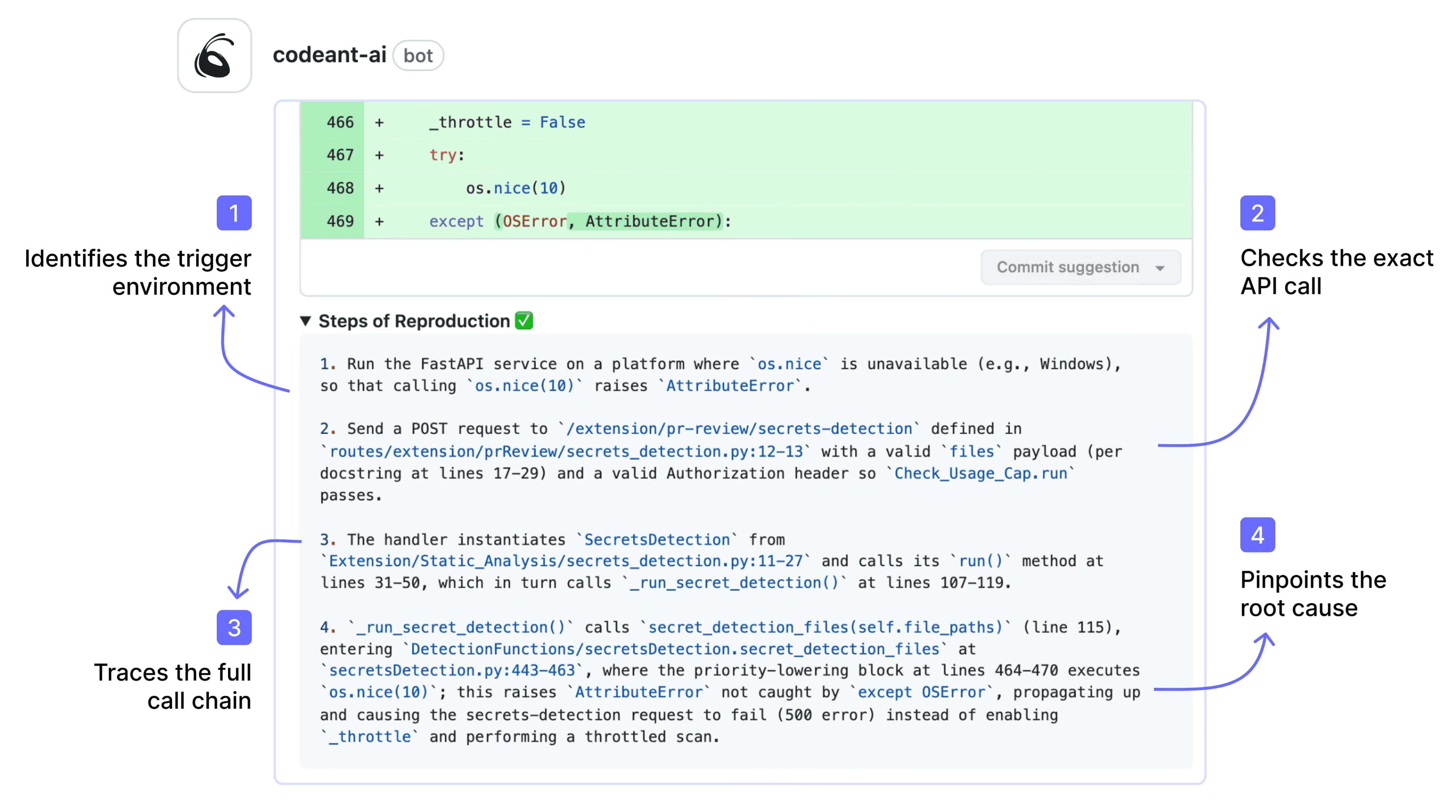 Where other SAST tools post a CWE number and line reference in the PR comment, CodeAnt AI provides the full attack path, the exact conditions needed to trigger the vulnerability, the exploitation scenario, and a one-click AI-generated fix.
