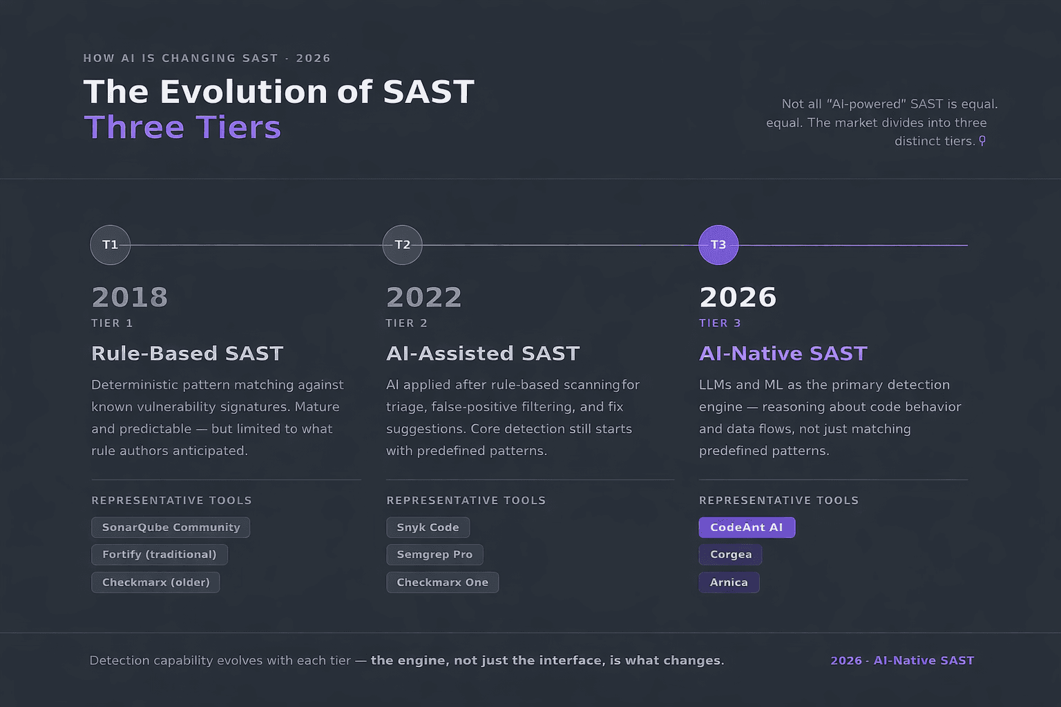 Not all “AI-powered” SAST tools are created equal. The market divides into three distinct tiers: