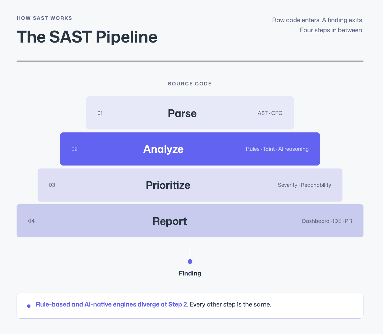 Rule-Based and AI Analysis: The engine applies security rules, pattern matching, taint analysis, or AI-powered behavioral reasoning, to identify code that matches known vulnerability signatures or exhibits risky data flows.