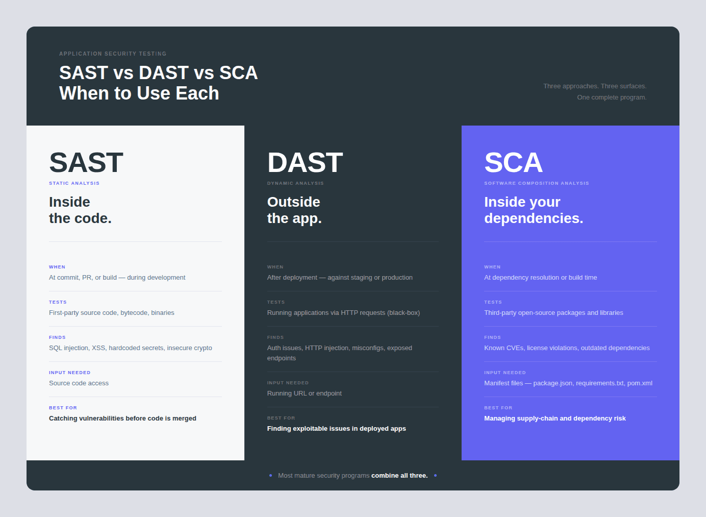 Three testing approaches form the foundation of a modern application security program. Each addresses a different surface area.