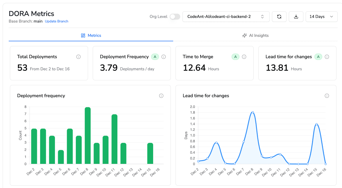 DORA metrics—deployment frequency, lead time, change failure rate, and MTTR—connect code review efficiency directly to delivery performance. CodeAnt AI provides these metrics in a unified dashboard across repositories.