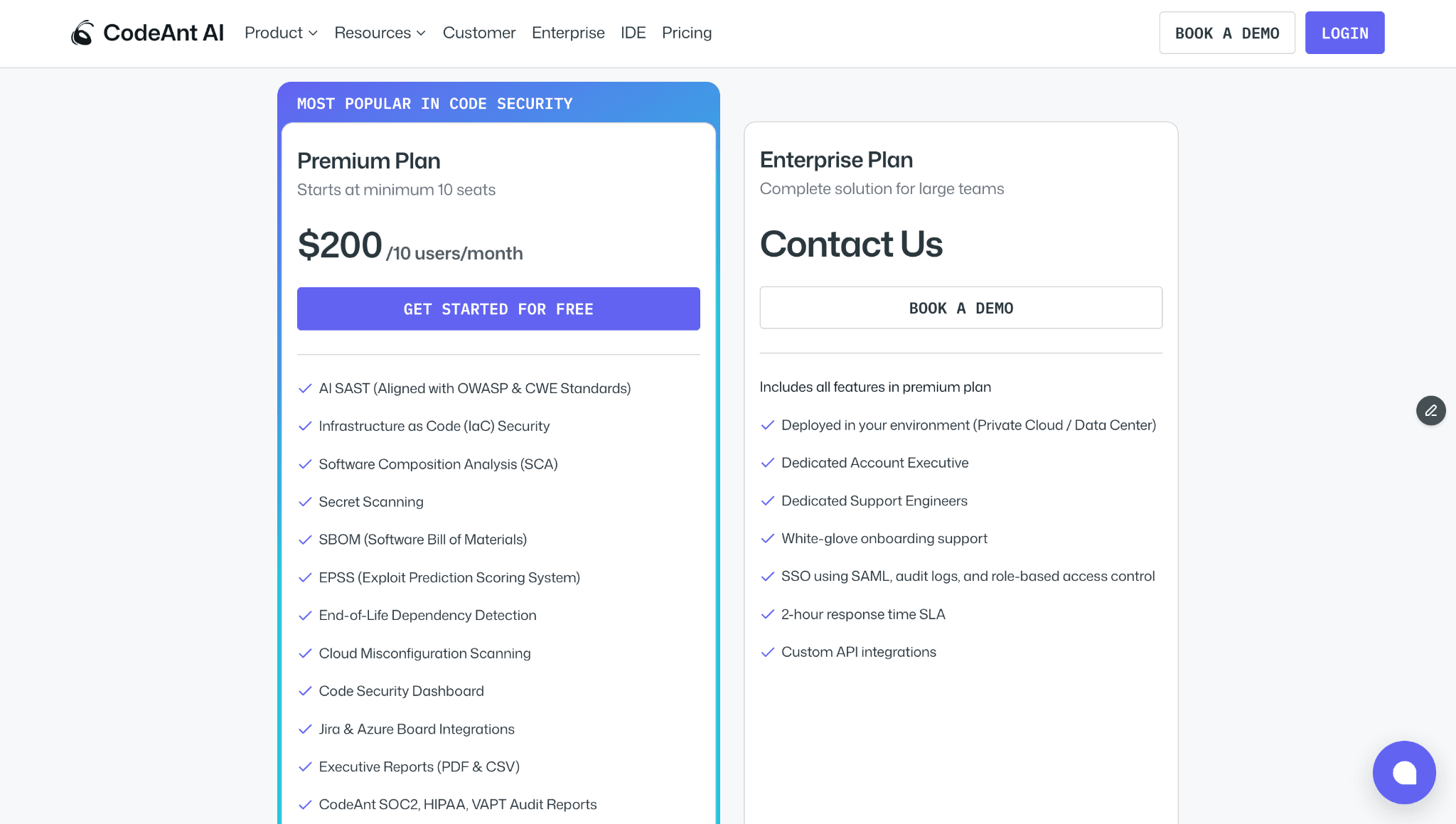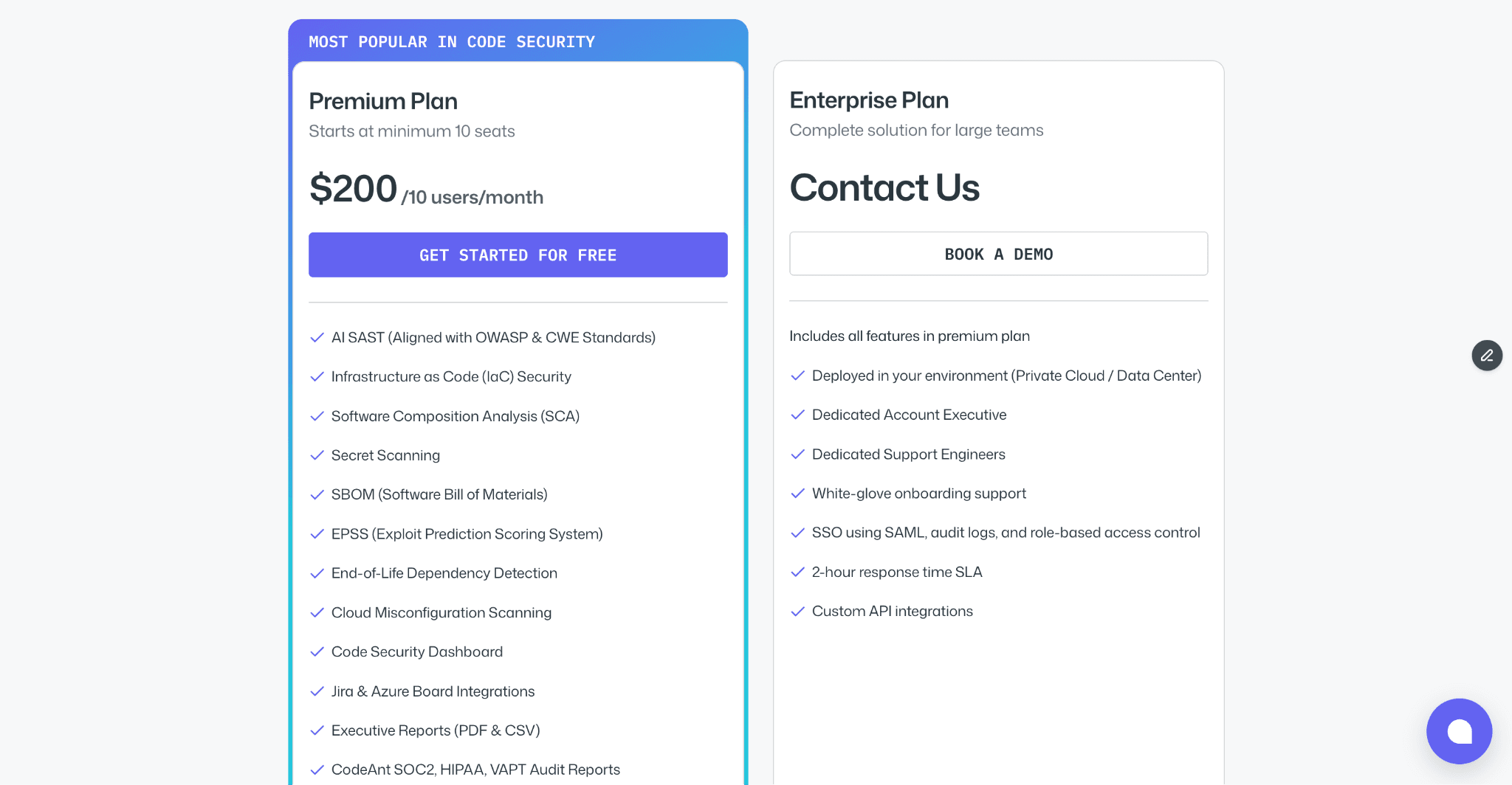 CodeAnt AI publishes pricing on its website: $20/user/month for Code Security.