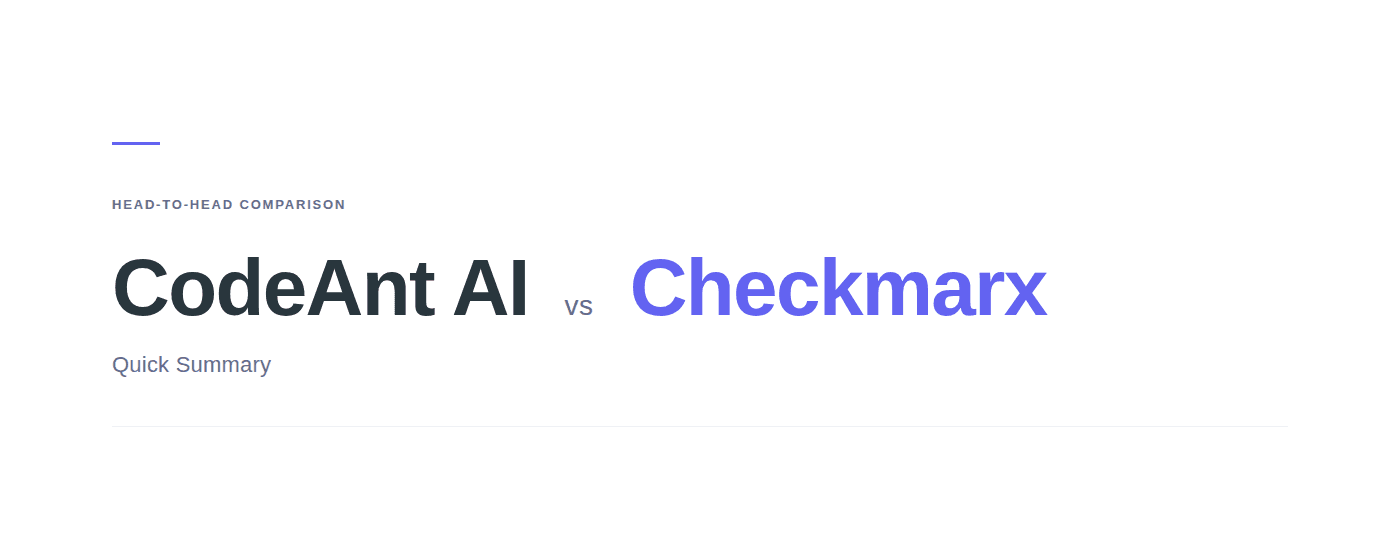 Meta Title: CodeAnt AI vs Checkmarx: Enterprise SAST Comparison 2026 Meta Description: Compare CodeAnt AI and Checkmarx SAST across detection architecture, compliance coverage, developer workflow, pricing, and enterprise deployment models. Description: See how AI-native SAST compares to Checkmarx’s rule-based and AI-assisted engine across detection accuracy, workflow, and compliance mapping. Slug: |