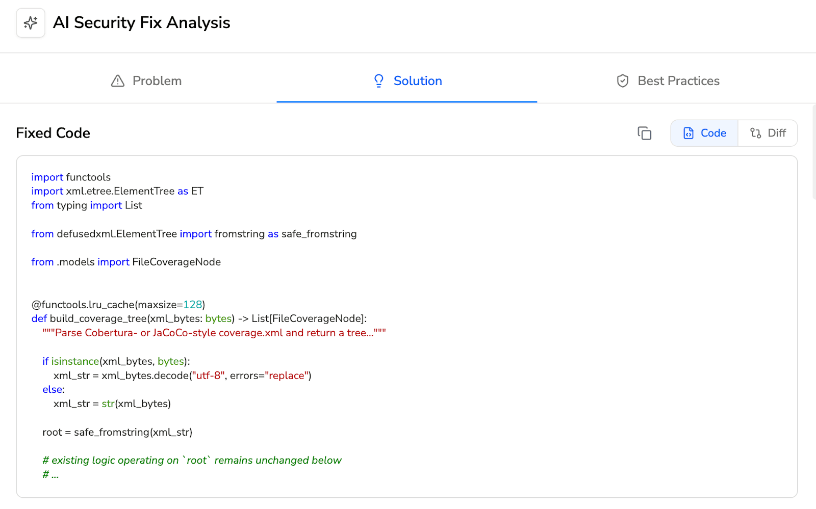 No manual remediation, no separate fix MR. At scale, dozens of findings per sprint across multiple projects, the difference between “here’s what’s wrong” and “here’s the fix, click to apply” is substantial in terms of remediation velocity.