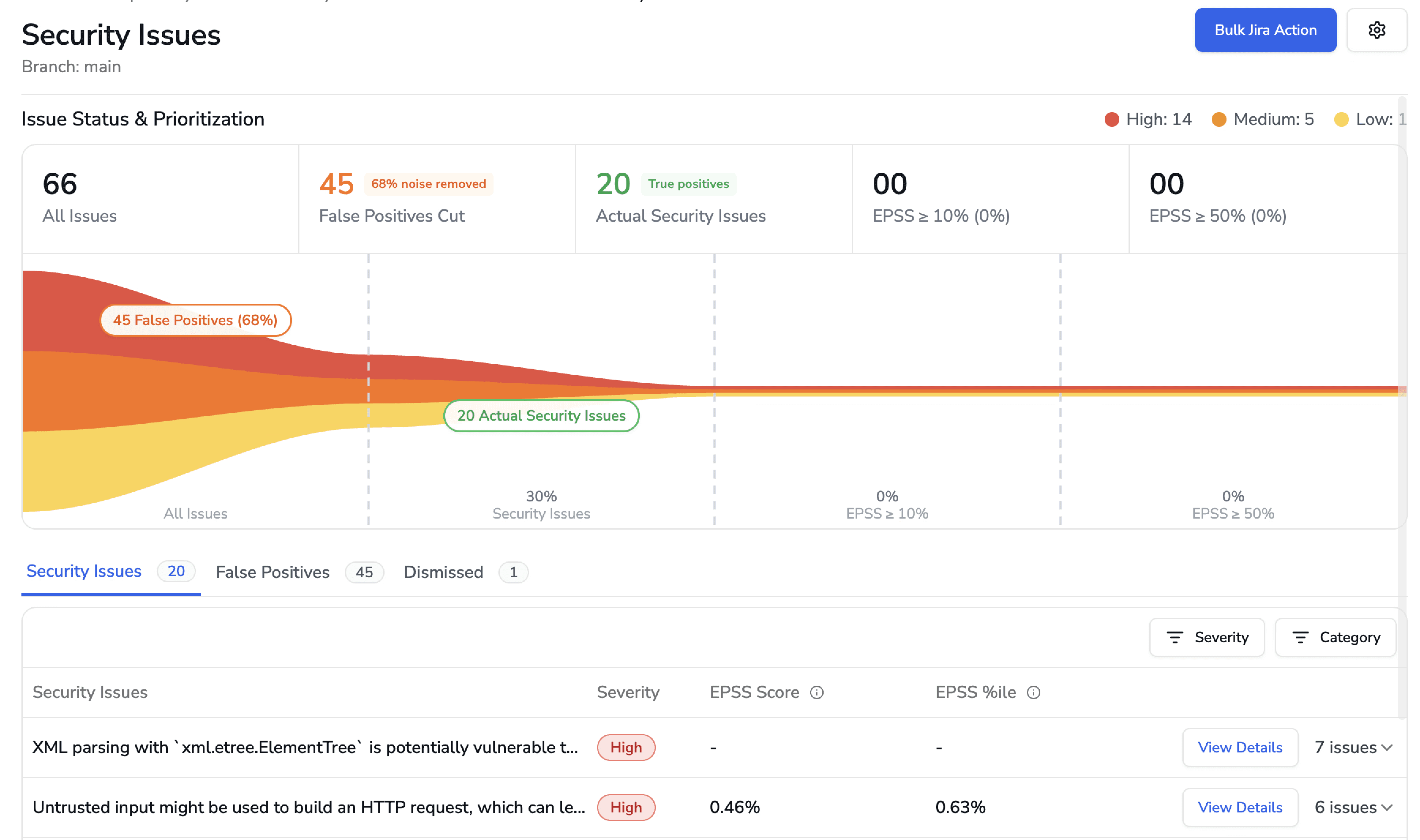 SecOps / Compliance | ✓ Vulnerability Management Dashboard provides centralized findings across all projects. Vulnerability tracking, assignment, status management, SLA monitoring, compliance reports. Integrated with GitLab Issues for triage-to-resolution workflow. Mature and well-designed for GitLab-native teams. | ✓ Unified SecOps dashboard: vulnerability trends, TP/FP rates, fix rates, EPSS scoring, OWASP/CWE/CVE mapping, team/repo risk distribution. Native Jira and Azure Boards. Audit-ready PDF/CSV for SOC 2, ISO 27001. Attribution reporting. |