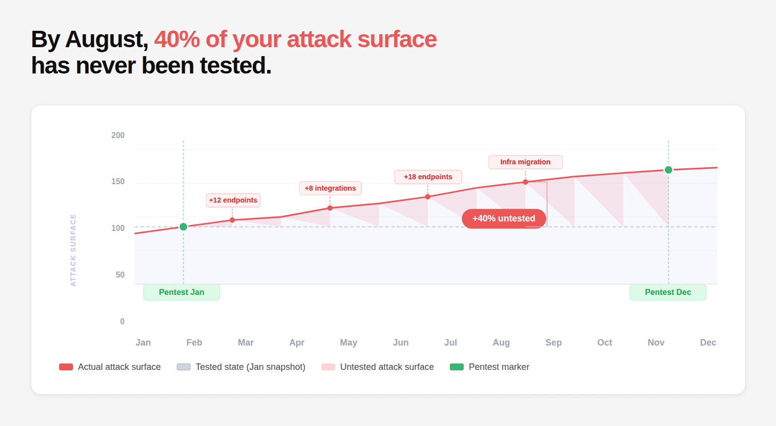 Attack surface doesn't just grow, it drifts. New endpoints get added. Old endpoints get modified. Authentication logic gets refactored. Infrastructure gets reconfigured. The attack surface tested in January is materially different from the attack surface that exists in August.