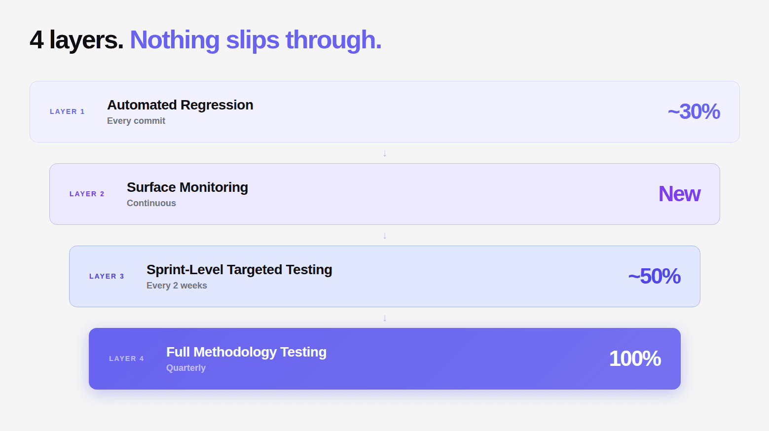 LAYER 4: Deep Manual + AI Testing (Monthly/quarterly, comprehensive)