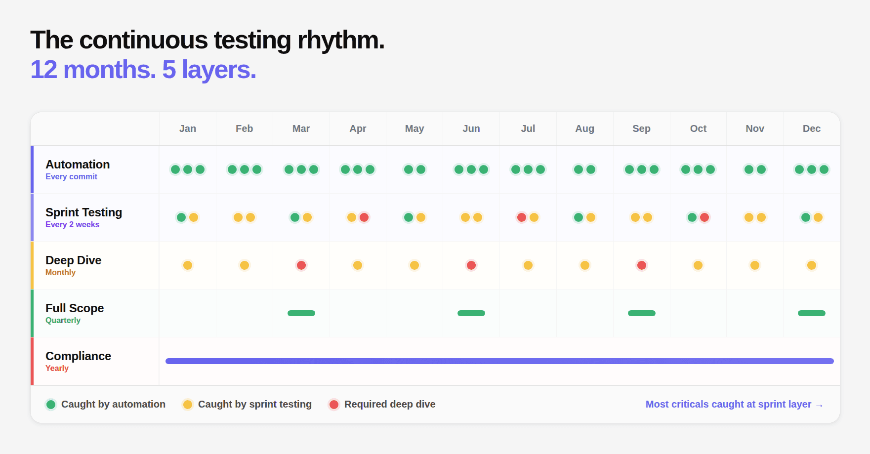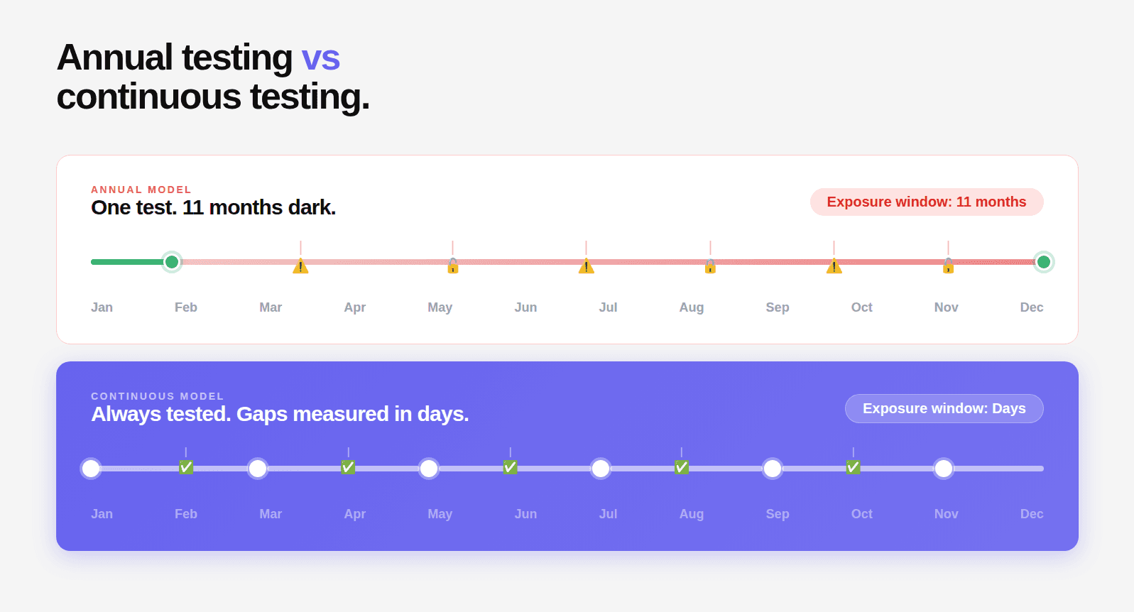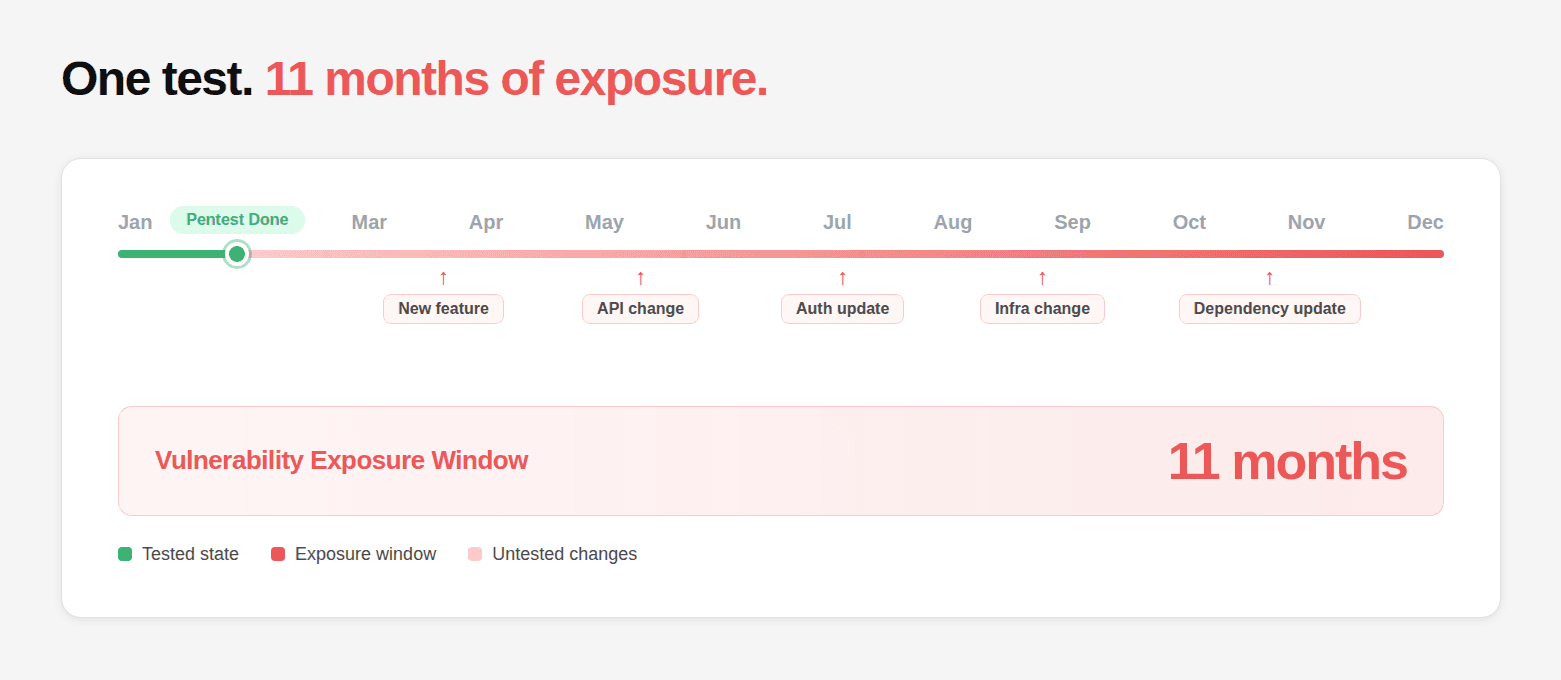 In an annual testing model, that gap can stretch for months. A system may be “secure” at the moment of testing, but every change that follows creates new, untested surface area. By the time the next test arrives, the application has already evolved far beyond what was originally evaluated.