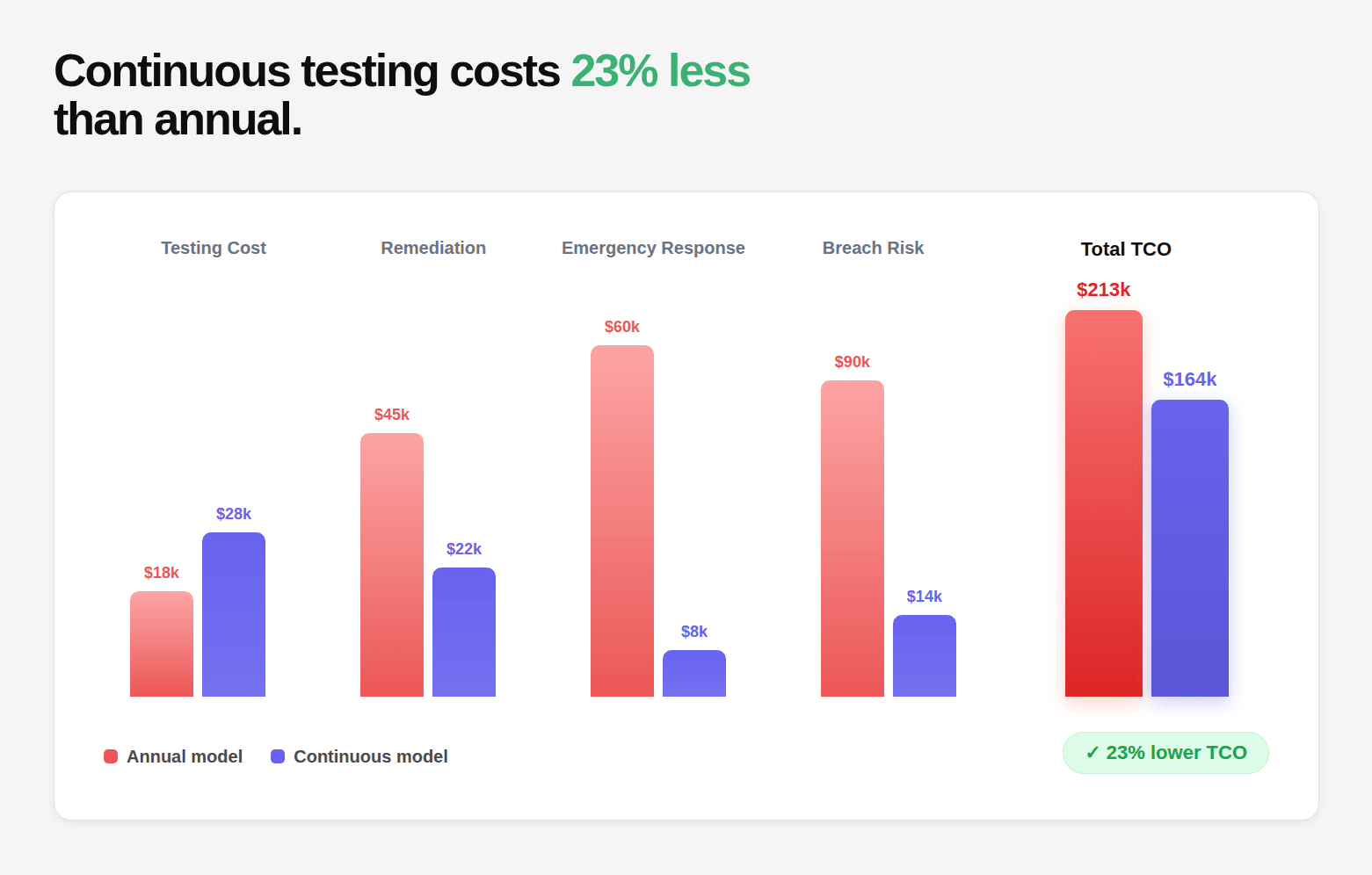 The surface-level cost comparison (annual pentest = one invoice) consistently underestimates the true cost of the annual model and overestimates the cost of continuous testing: