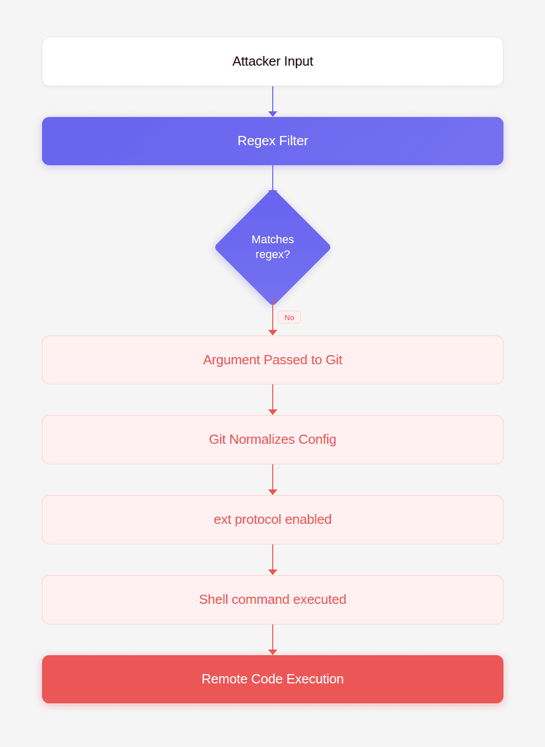 That mismatch allowed attackers to bypass the filter and execute arbitrary shell commands through Git's ext:: protocol.