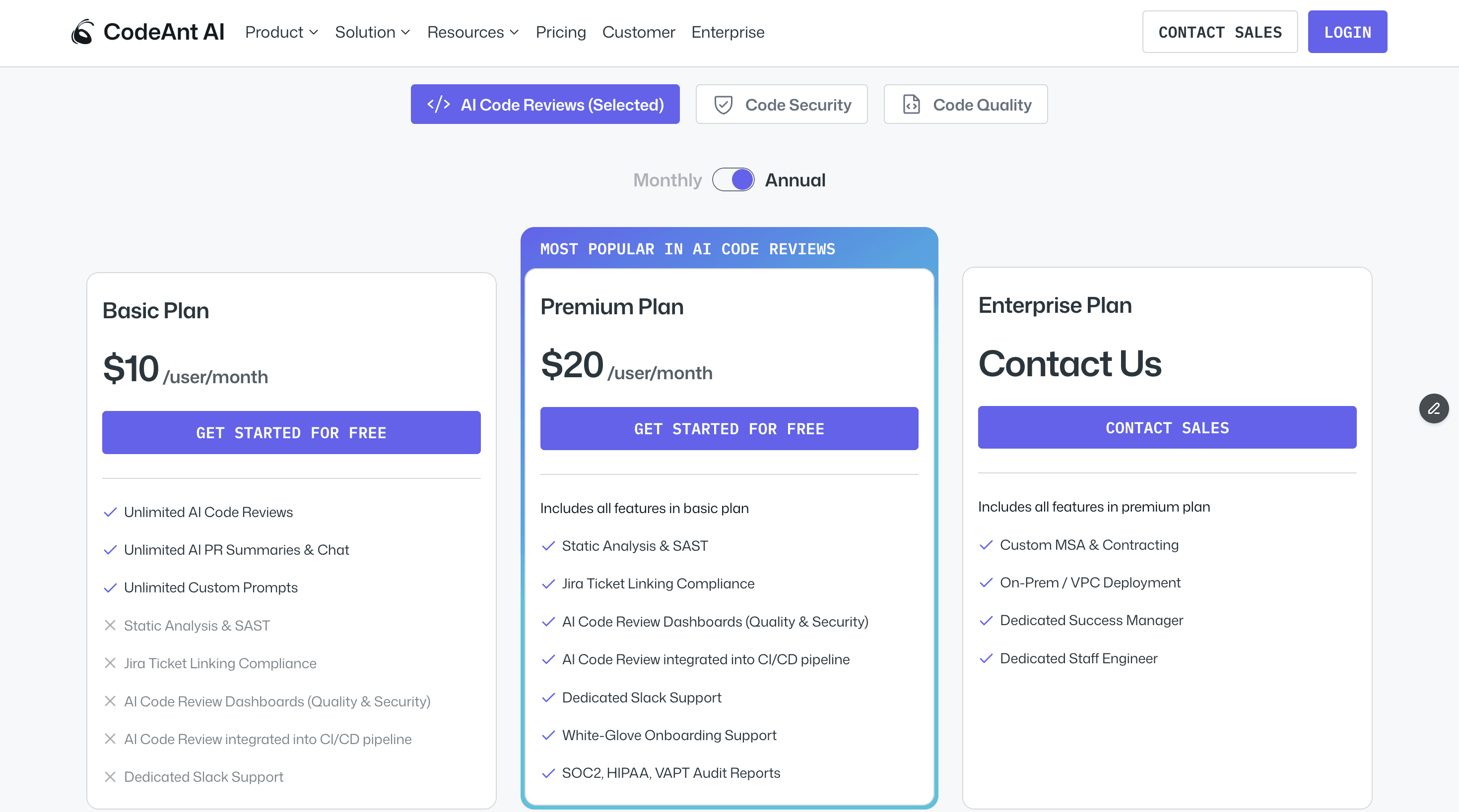 14-day free trial, No credit card required. After that AI Code Reviews are: $10/user/month [Basic Plan], Premium plan starting from $20/user/month.