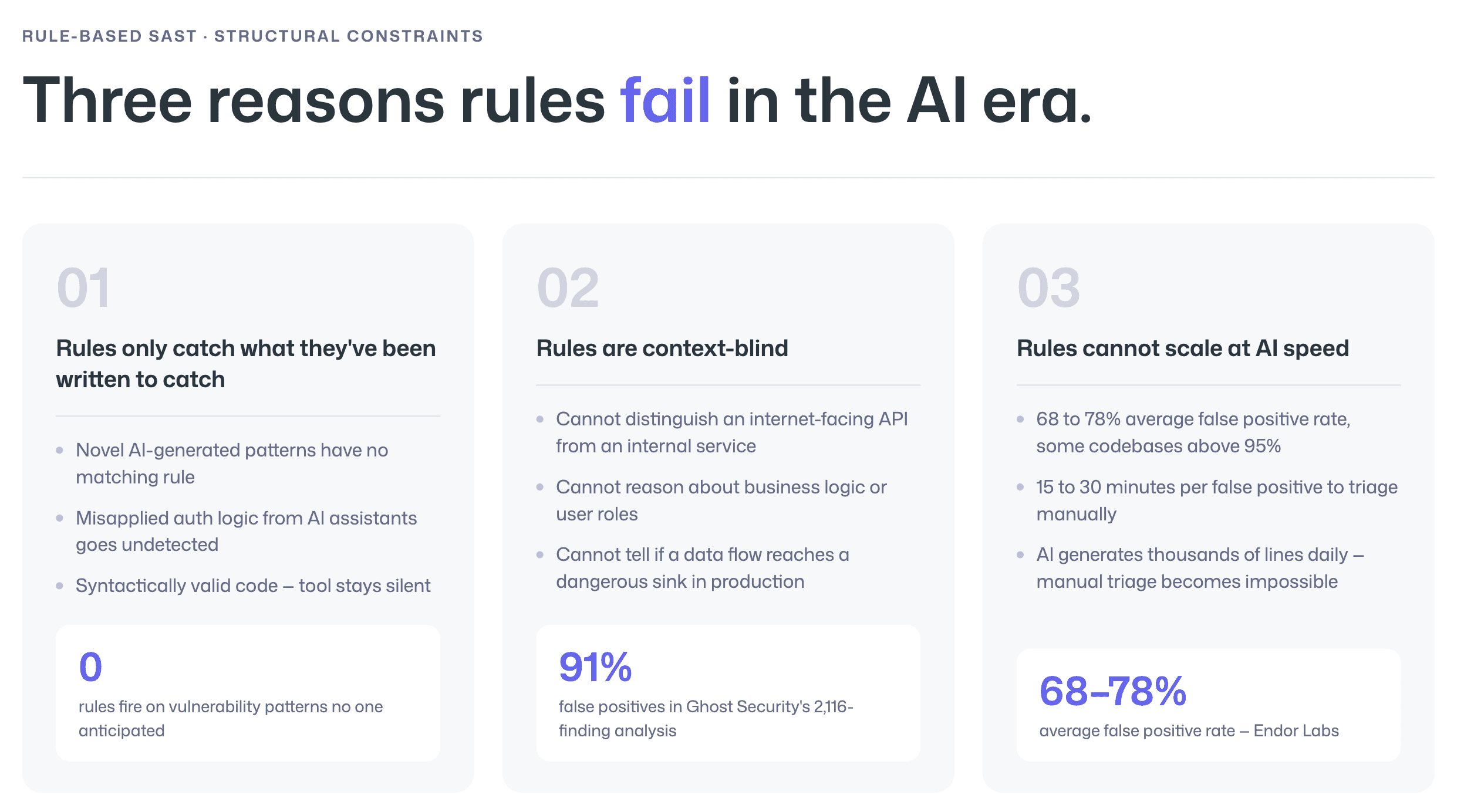 Ghost Security analyzed 2,116 findings from traditional SAST and found that only 180 were real vulnerabilities, roughly 91% were false positives.