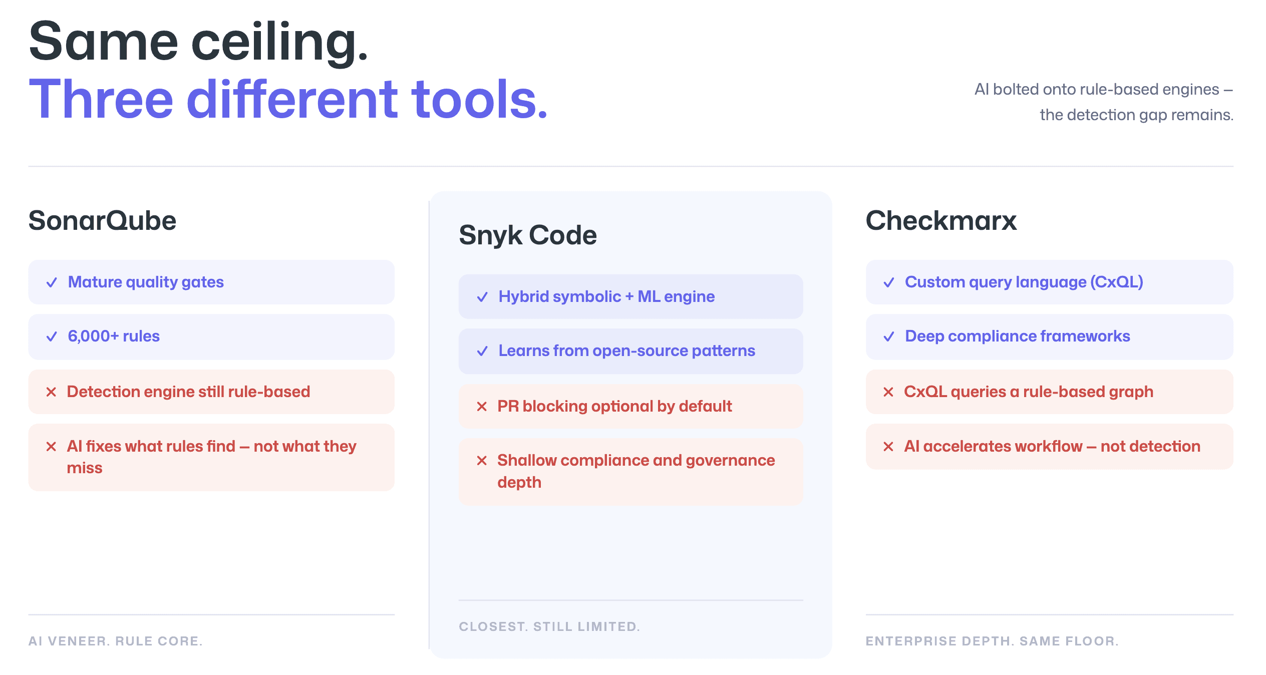 Traditional SAST vendors built much of this infrastructure over decades. SonarQube's quality gates, Checkmarx's compliance presets and ASPM dashboards, and Snyk's policy manager all represent genuine enterprise workflow depth.