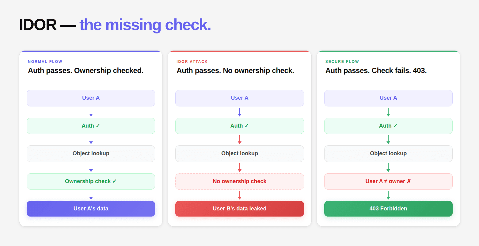 The third step is where the vulnerability lives. Not in the existence of the identifier. Not in the exposure of the identifier. In the missing ownership verification between "this identifier was supplied" and "this object was returned."