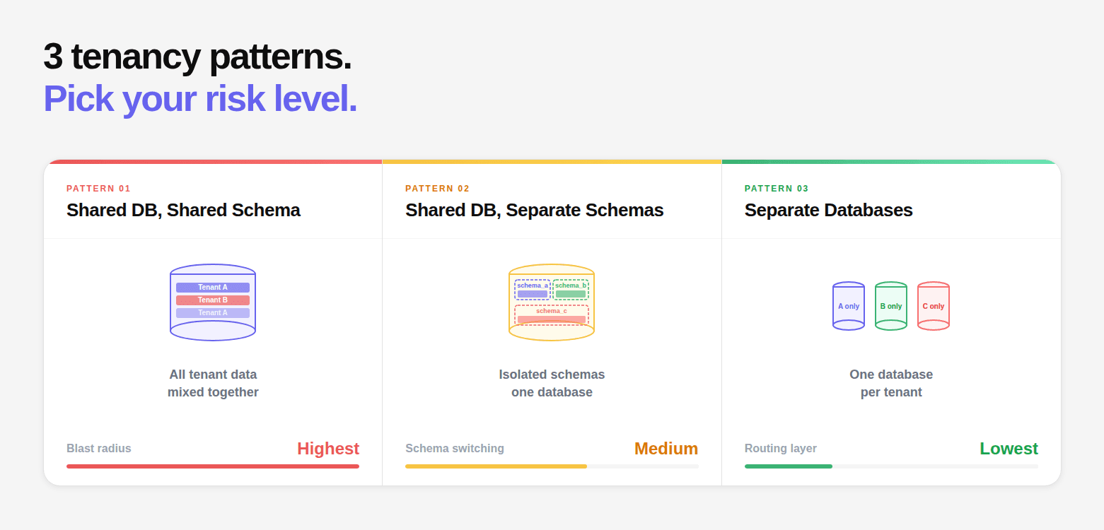 Before testing, you need to understand the architecture. Multi-tenancy is implemented in fundamentally different ways, and the vulnerabilities, and testing approach, differ significantly by pattern.