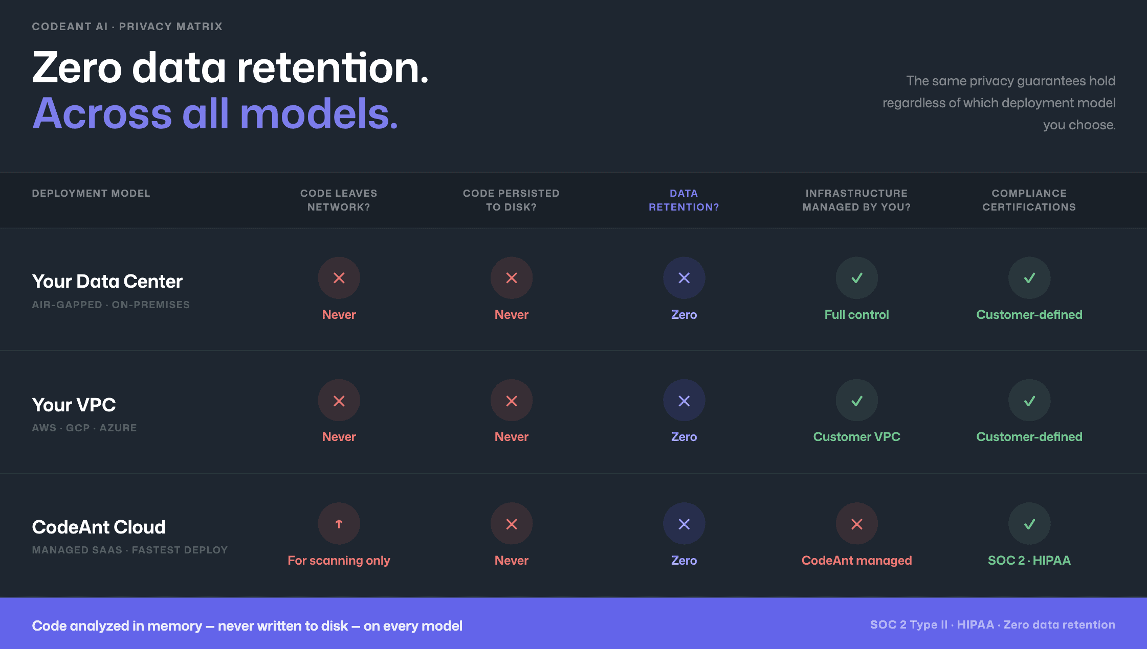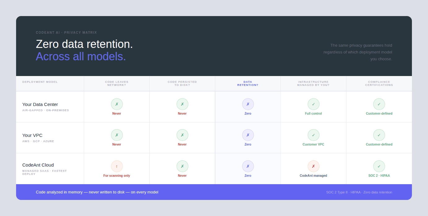 CodeAnt AI offers three enterprise deployment models designed for different data residency requirements, from fully air-gapped installations to managed cloud.