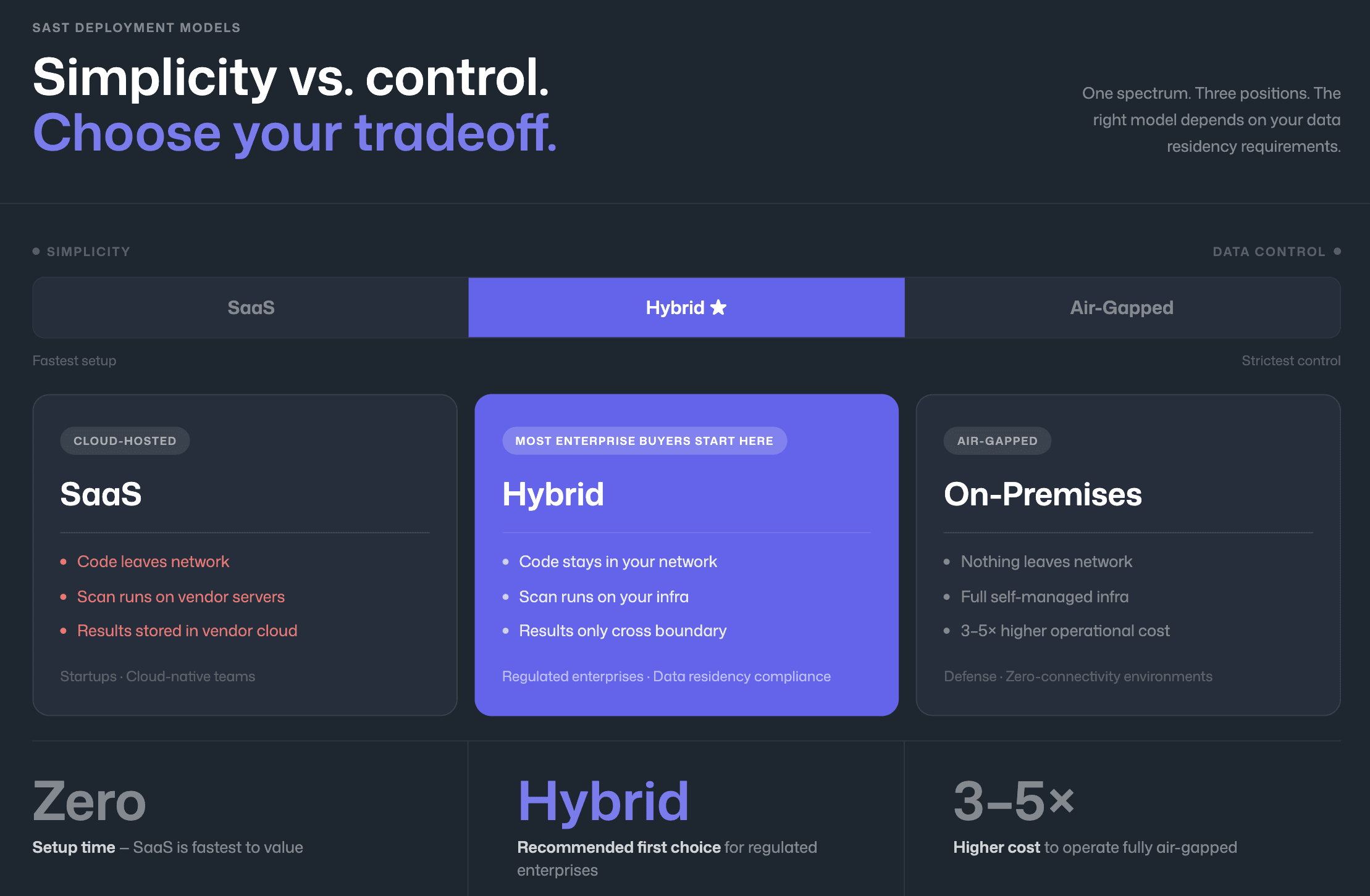 Every SAST tool falls into one of three deployment models. The critical distinction is not “cloud vs. on-prem,” it is where the scan executes and what data leaves your network.