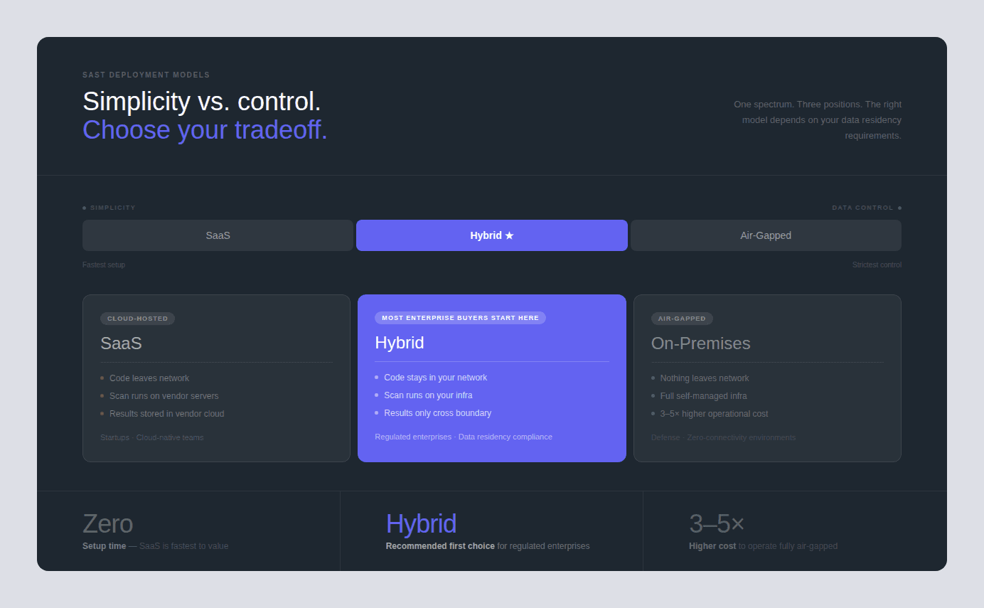 This model preserves source code privacy while retaining the convenience of a cloud-hosted dashboard for trend analysis, compliance reporting, and team management. It is the deployment model that most enterprise SAST buyers should evaluate first, because it addresses the core data residency concern (source code privacy) without the operational burden of fully self-hosted infrastructure.