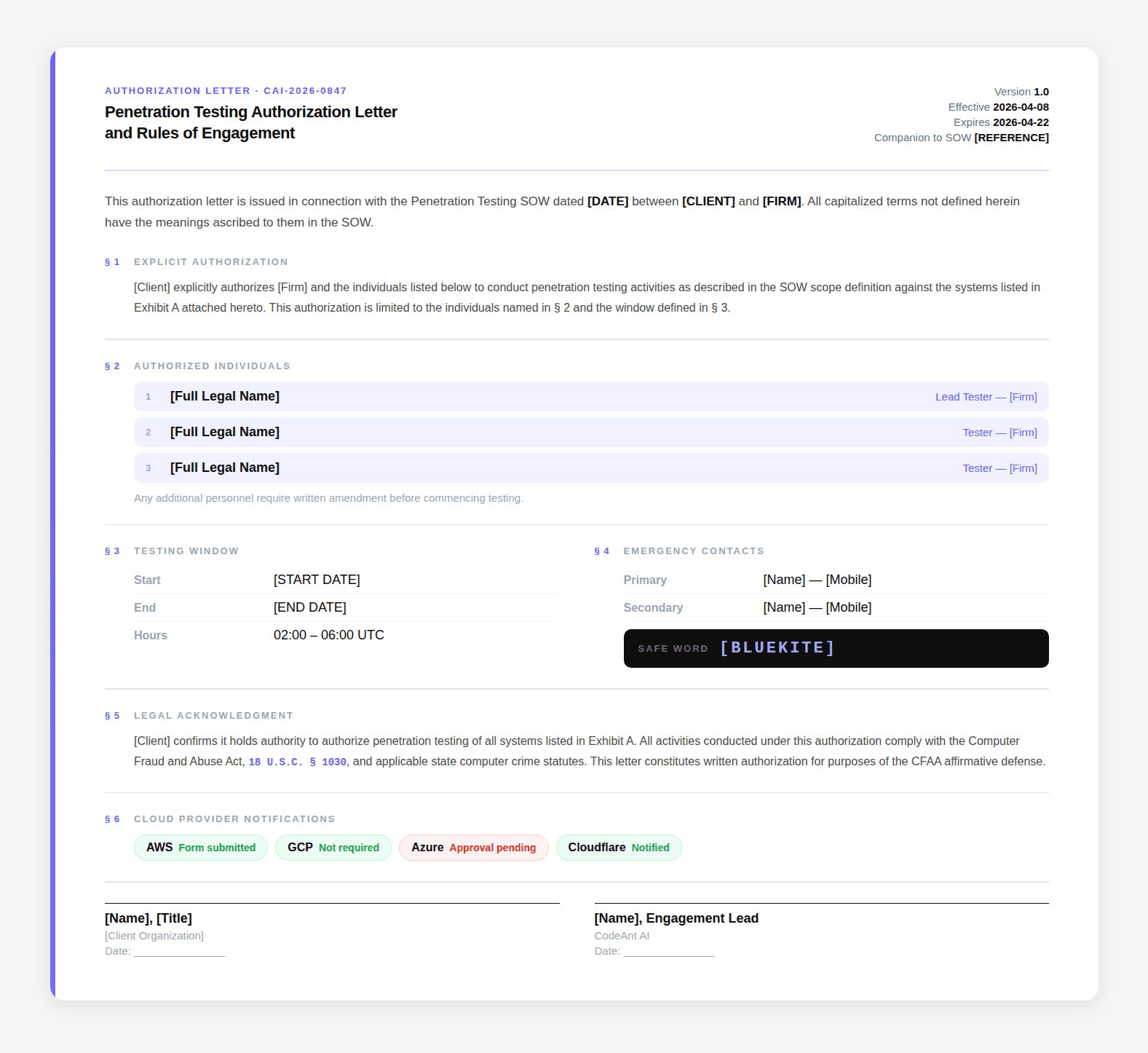 This is not always wrong. A well-drafted SOW can include authorization language. But most SOWs don't, they're commercial documents covering scope, pricing, deliverables, and IP. The authorization language that makes testing legally permissible is different from the commercial terms that govern the engagement.