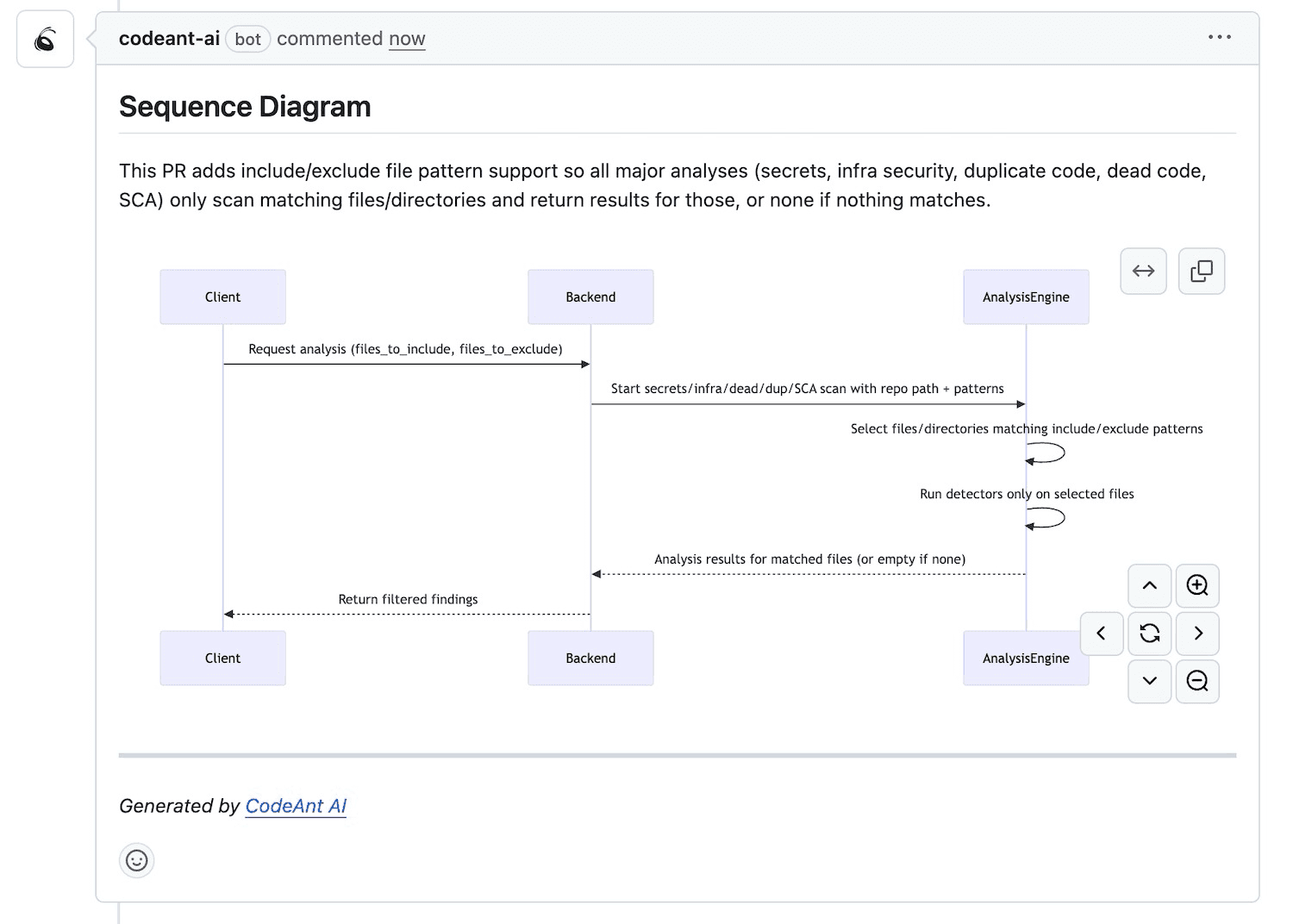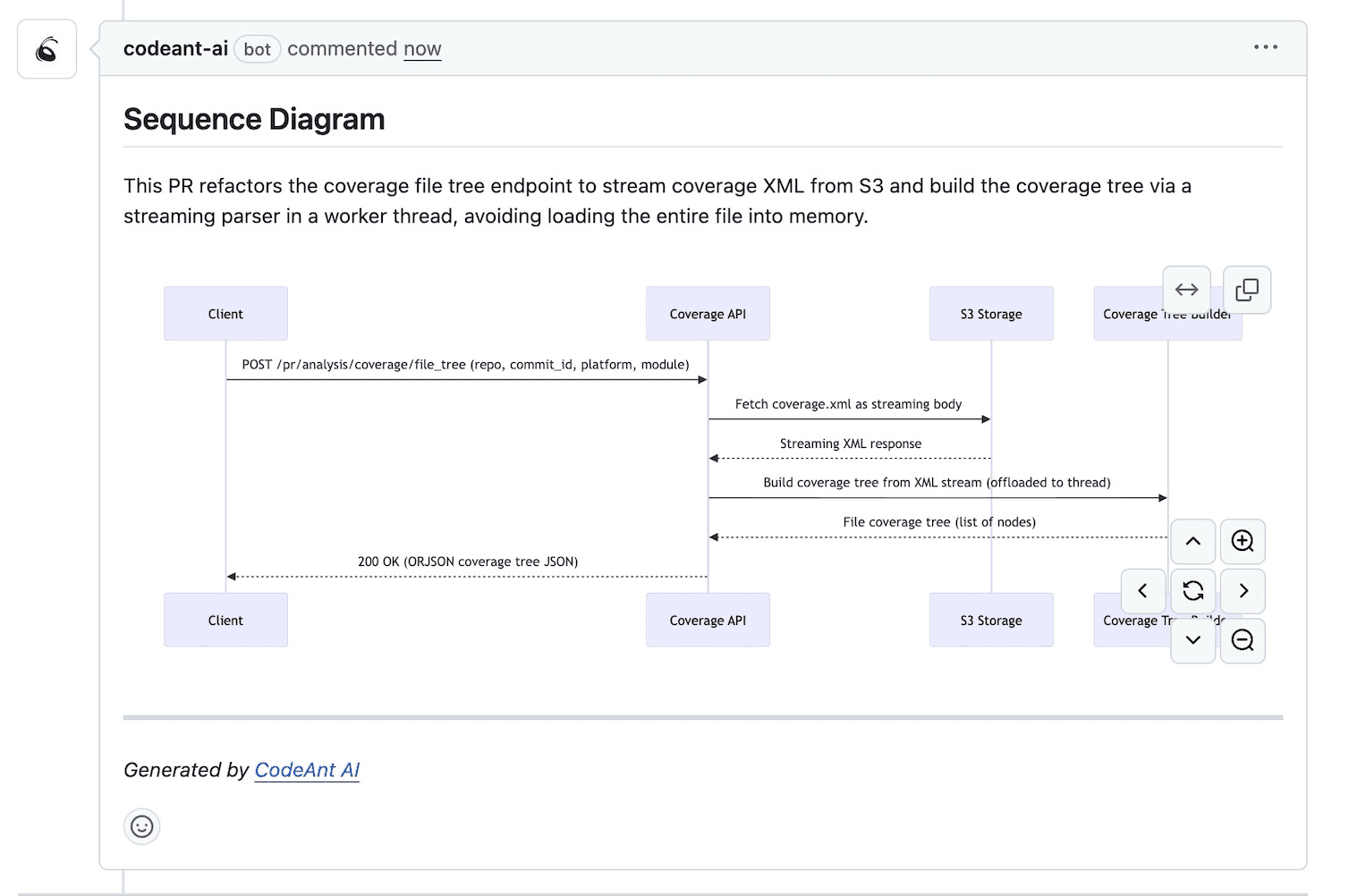 CodeAnt AI generates summaries automatically, along with sequence diagrams that capture the core runtime flow introduced by each change. Reviewers can triage quickly before examining individual files.