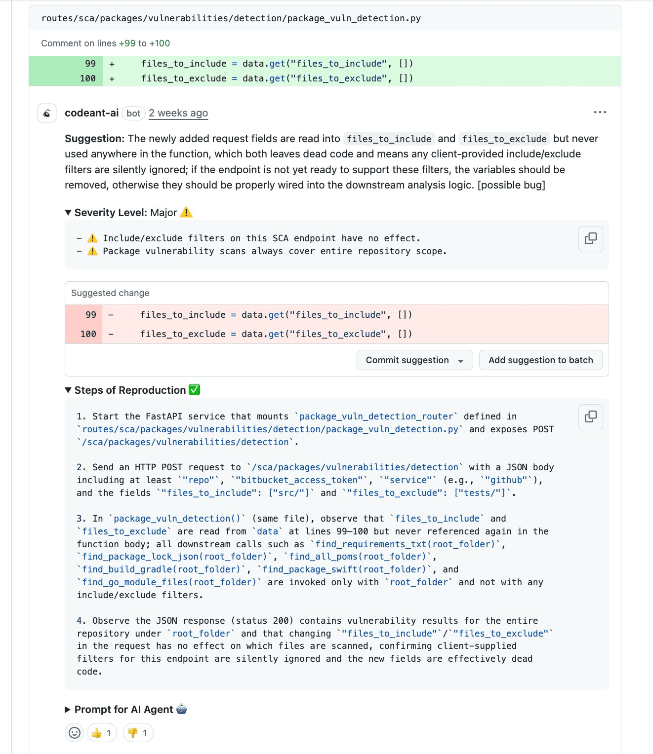Even if a "Major" issue like a silent wrong output is hard to trigger consistently, the AI will still flag it if the code logic (e.g., ignoring a filter configuration) is demonstrably broken.