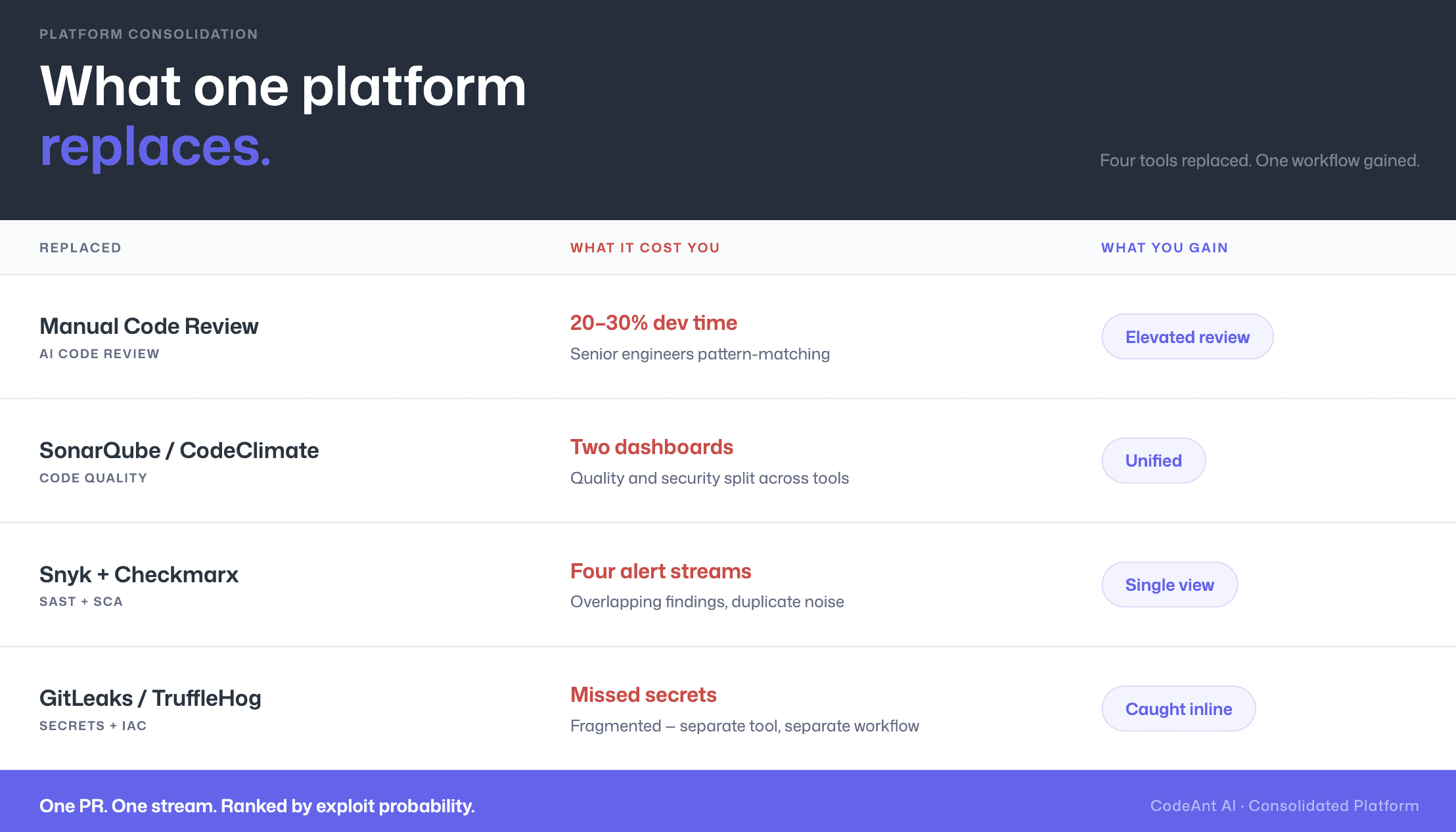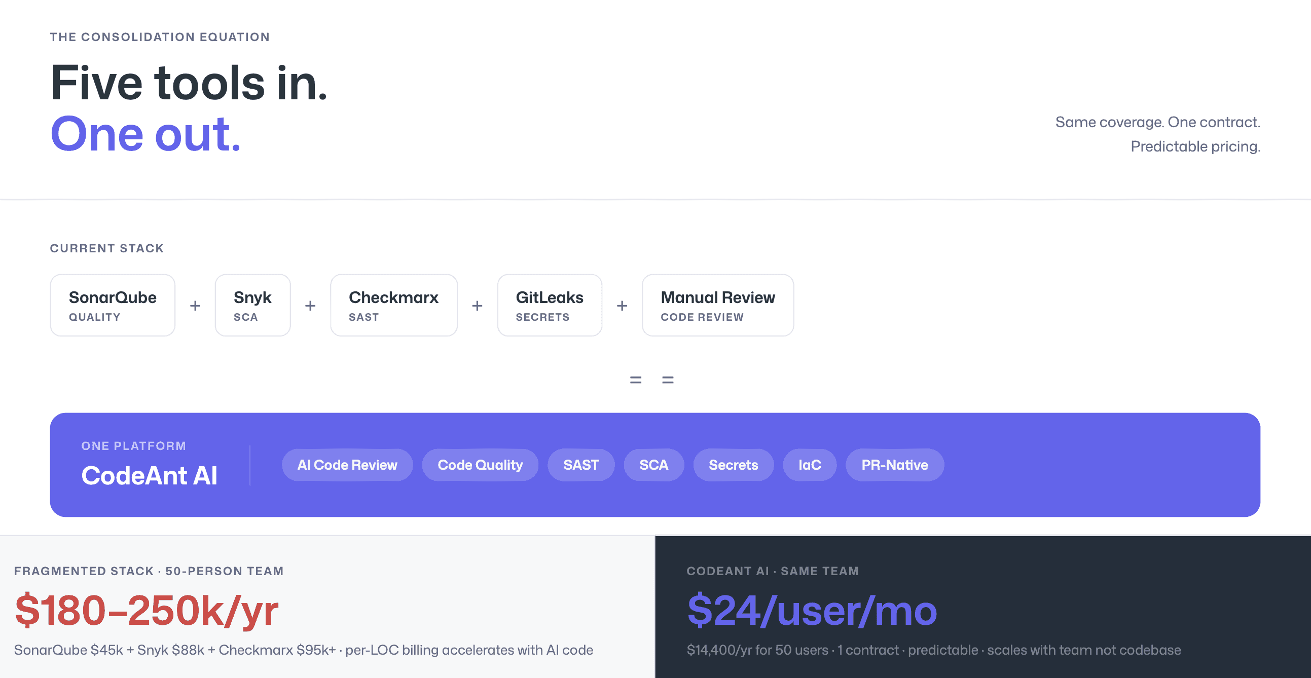 … in a single PR-native platform. This replaces the common enterprise stack of SonarQube + Snyk/Checkmarx + manual code review with one tool, one dashboard, and one pricing contract.