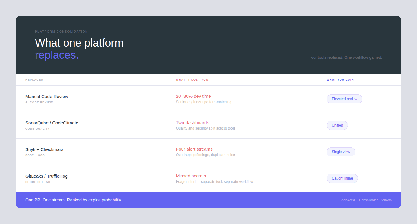Walk into any mid-size or enterprise engineering organization and you will find a familiar pattern: SonarQube for code quality, Snyk or Checkmarx for security scanning, and a manual process (or a separate tool) for code review. Each tool has its own dashboard, its own alert stream, its own pricing contract, and its own set of findings that developers must context-switch between. This is not a design, it is an accumulation. Each tool was adopted to solve a specific problem, and nobody went back to ask whether the problems could be solved by one platform instead of three.