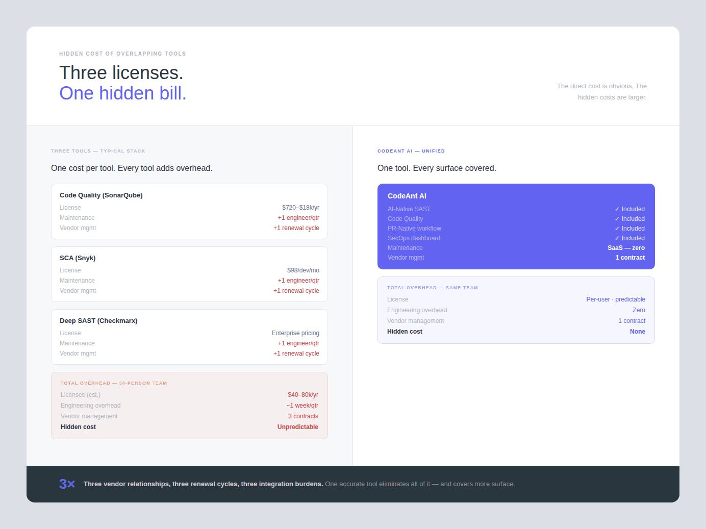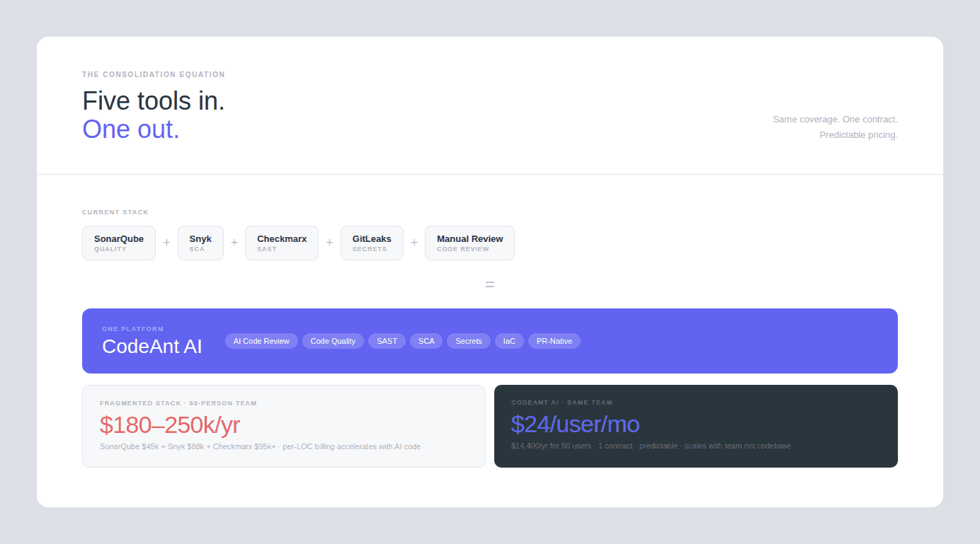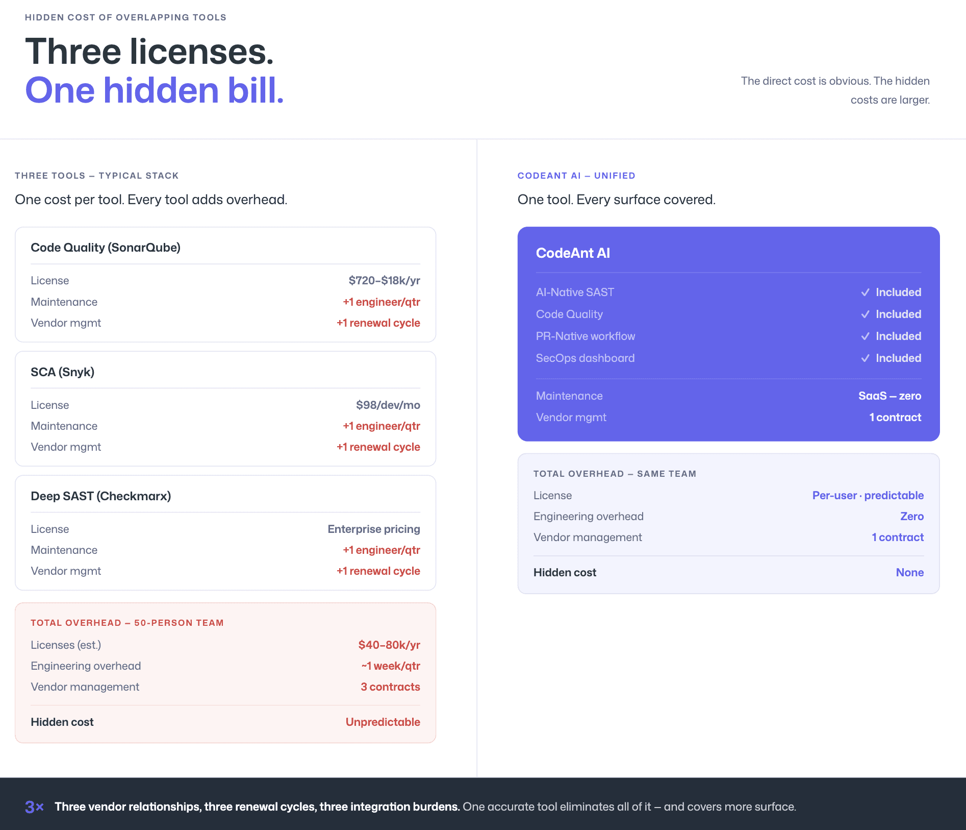 For a 50-person engineering team, the fragmented toolchain can easily total $80,000–$140,000 annually in licensing alone, before accounting for procurement overhead, integration maintenance, and the infrastructure costs of self-hosted tools like SonarQube Server.