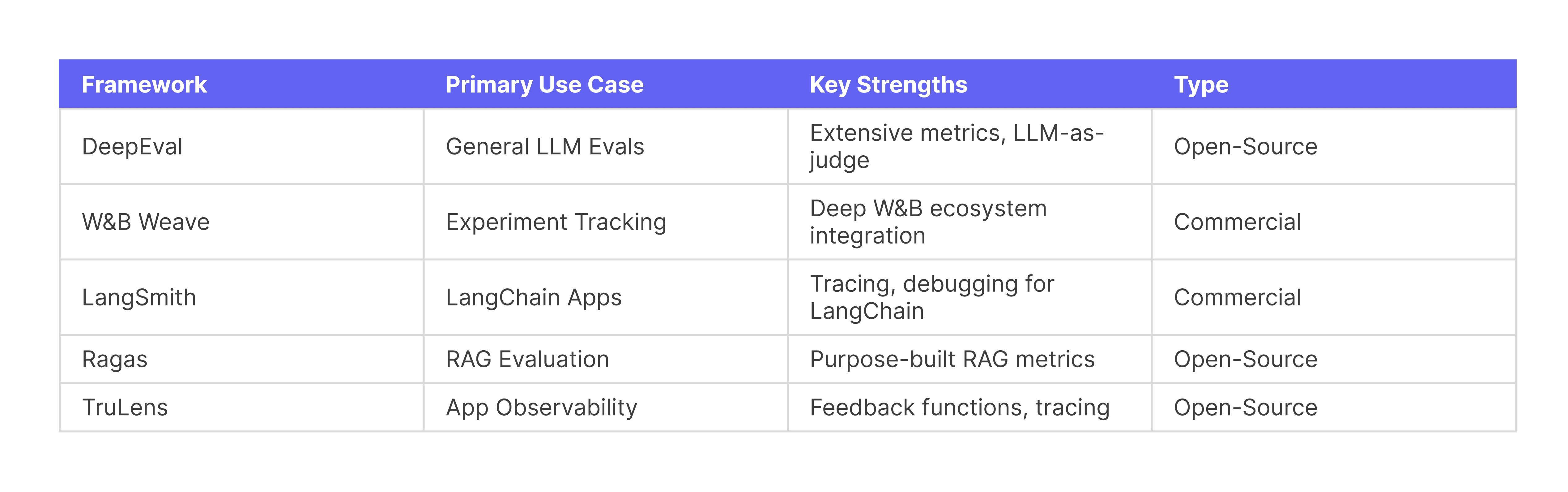 Several frameworks can accelerate your evaluation pipeline. Here's how they compare: