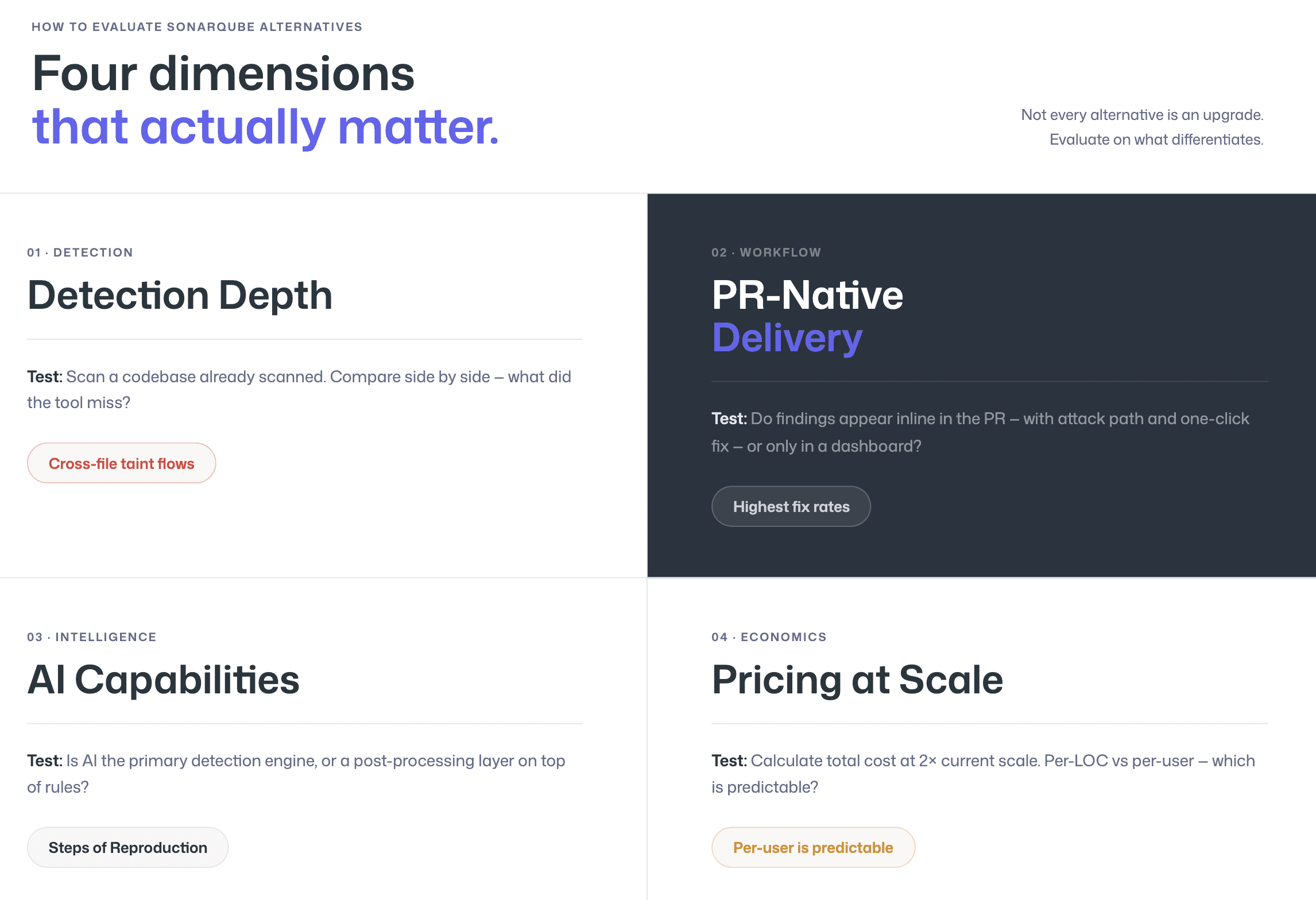Not every alternative to SonarQube is an upgrade. Some tools trade one set of limitations for another. The following evaluation framework focuses on the four dimensions where SonarQube alternatives most commonly differentiate.