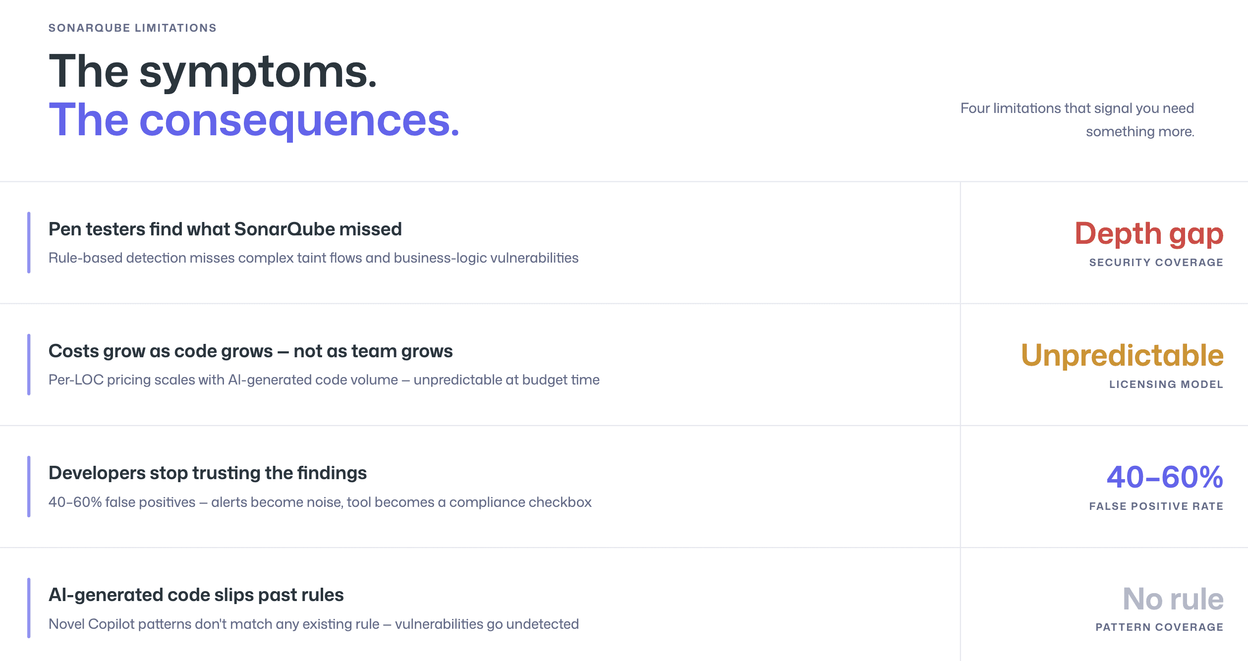 The tell-tale sign: your penetration testers keep finding vulnerabilities that SonarQube did not flag, or your security team supplements SonarQube with manual code review for anything high-risk.
