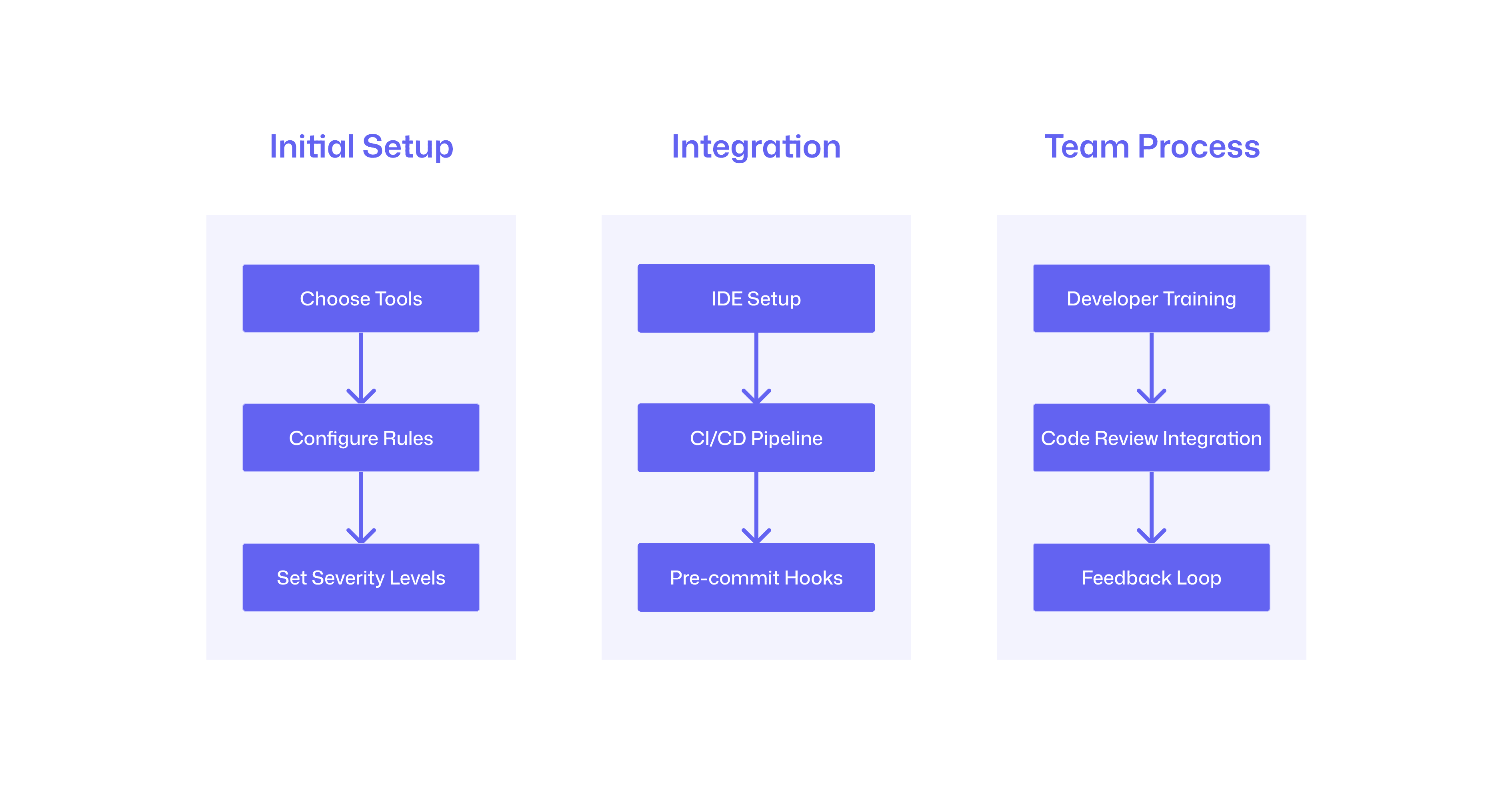 Start small -> Automate everything possible -> Make fixing issues easy for devs -> Review and adjust rules.