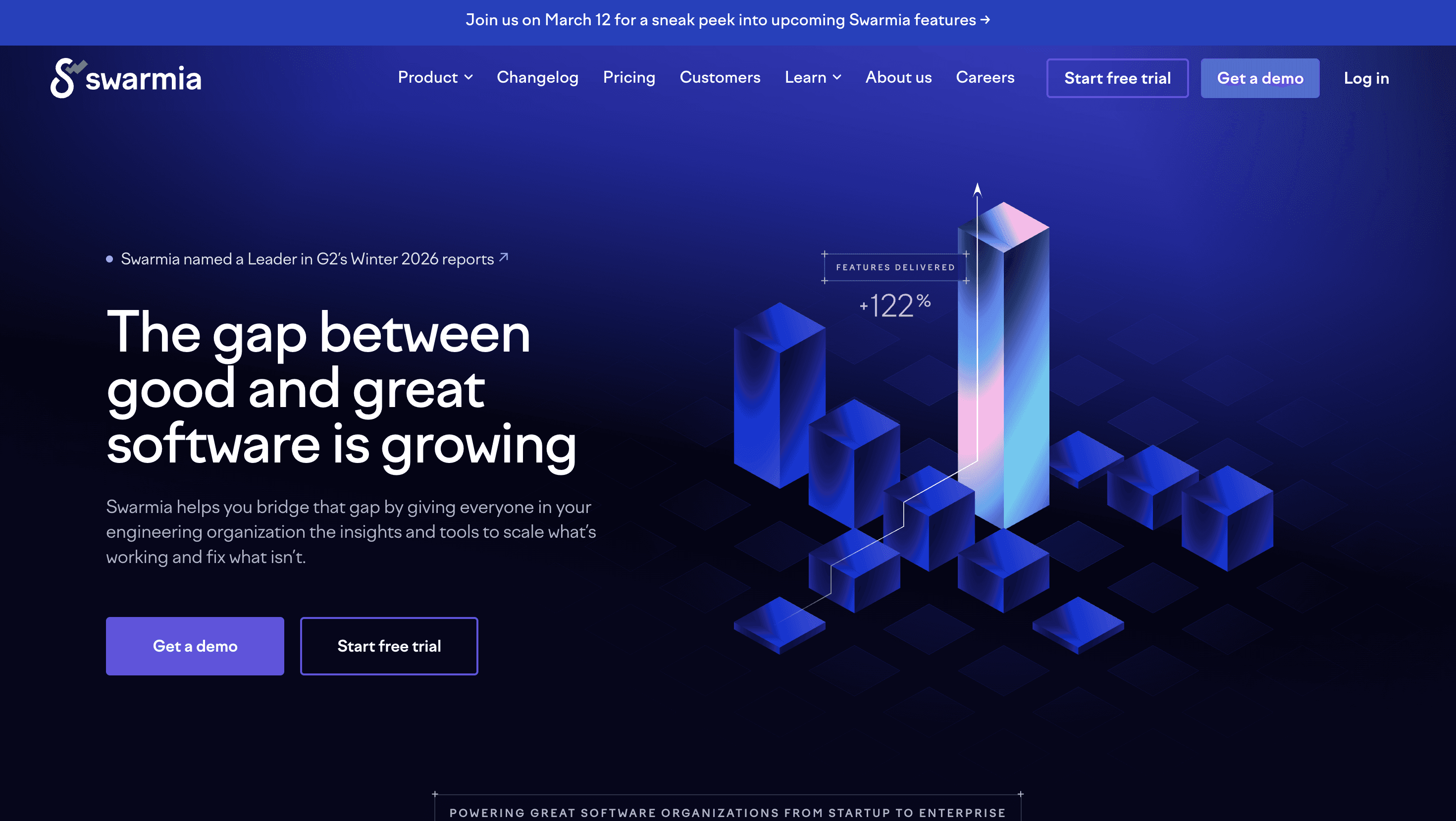 Swarmia (€20–39/developer/month) focuses on the SPACE framework and developer experience surveys alongside DORA metrics. Strong Slack integration for working agreements and automated reminders. GitHub-primary.