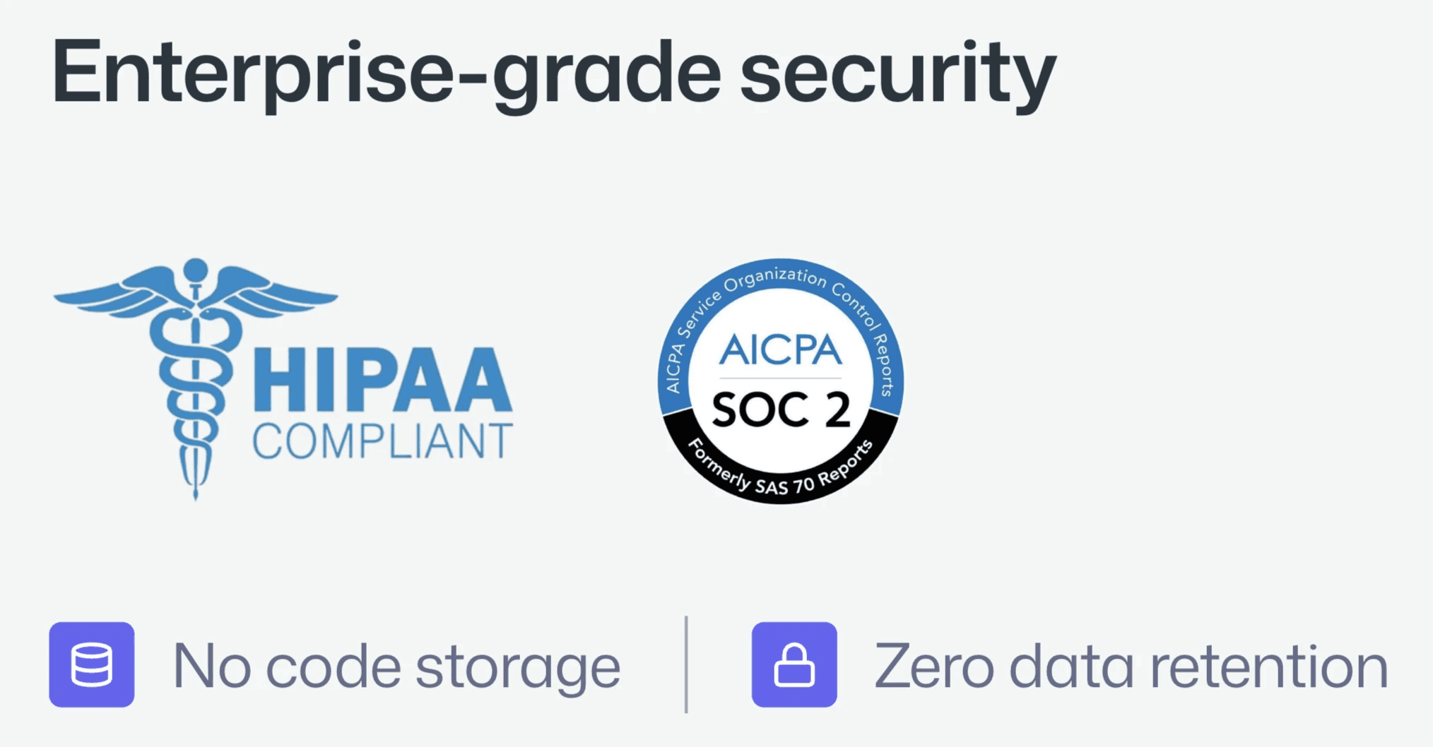 SOC 2 Type II and HIPAA compliant, with zero data retention, code is analyzed in memory and never persisted.