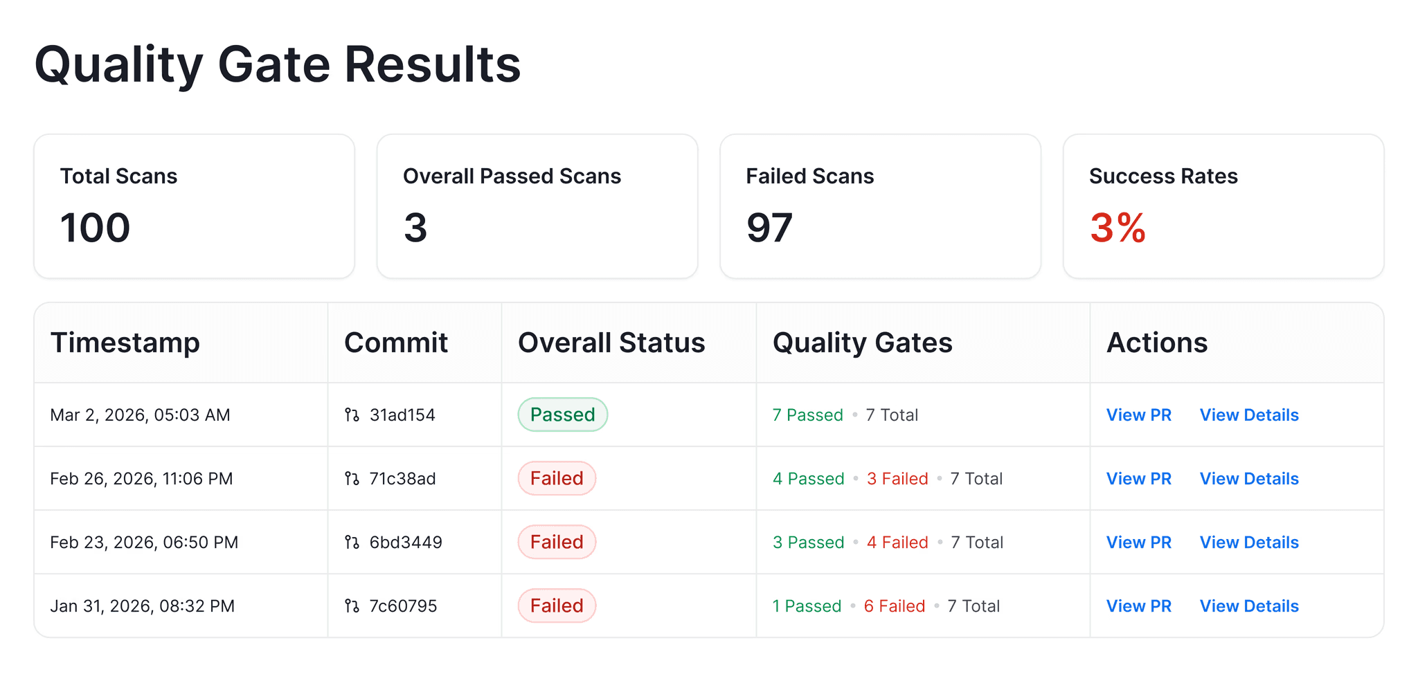 Quality gates block builds that fail security or quality thresholds. Audit reports export as PDF or Excel for compliance teams.