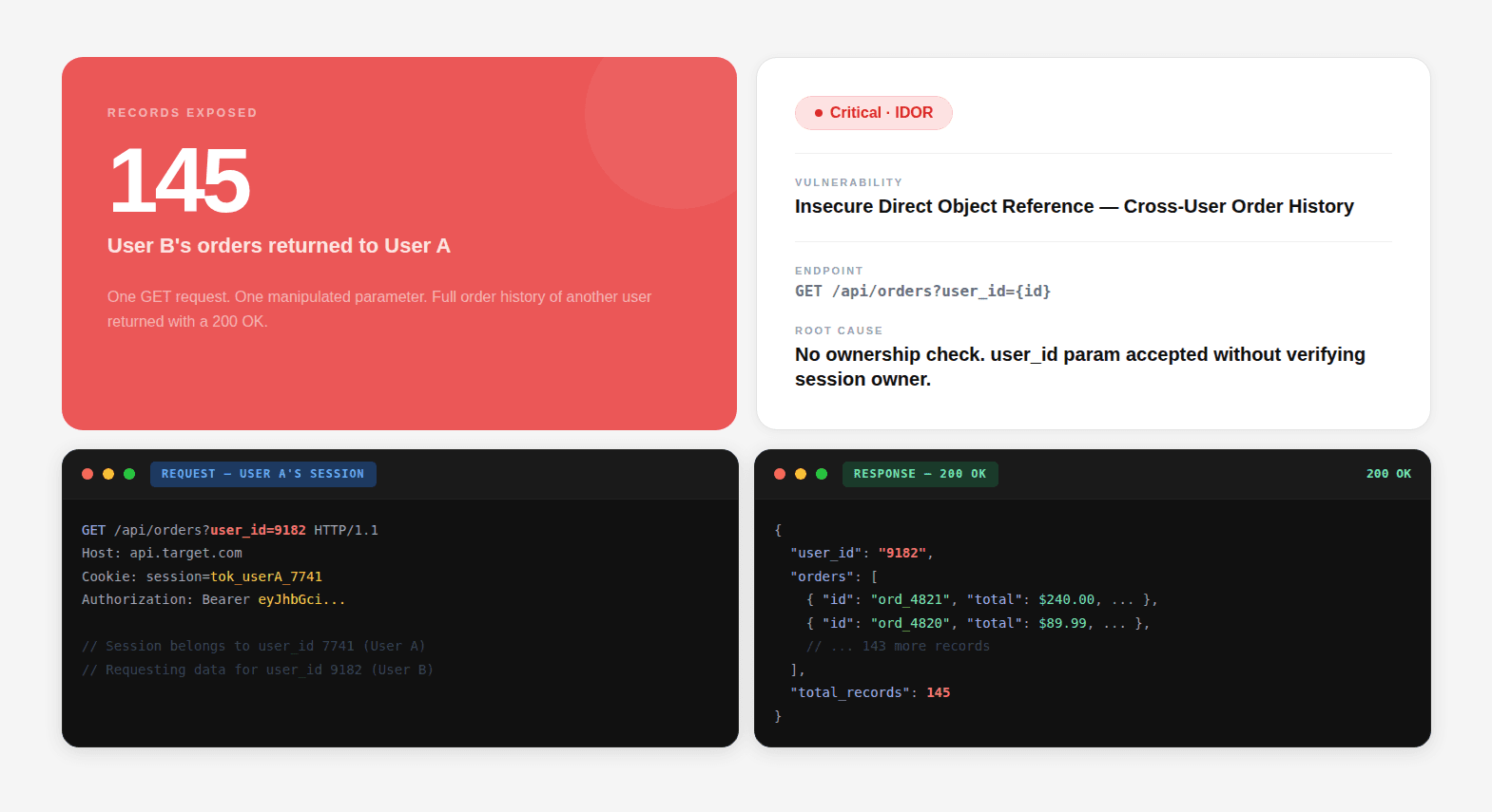 This is the most faithful simulation of what an external attacker with no prior knowledge or inside access would be able to do. The question a black box test answers is precise: what could someone on the internet, starting from nothing, actually do to your users' data?
