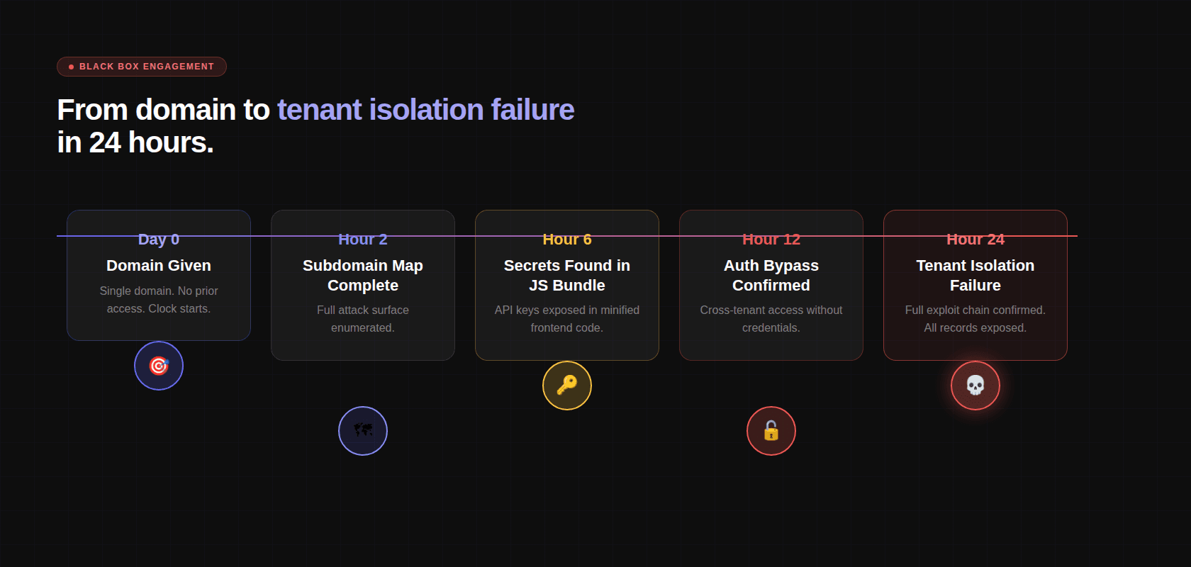 In a black box test, the tester starts with a single piece of information: your domain. No credentials. No code access. No documentation. No architecture diagrams. The inside of the system is opaque, hence "black box."