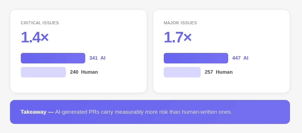 AI-generated code violates this assumption. That said, PRs now produce 1.7× more issues per PR, with logic errors 75% more common, security vulnerabilities 1.5–2× higher, and excessive I/O operations ~8× more prevalent.