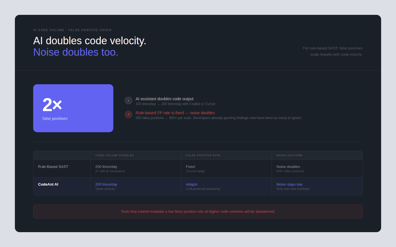 A tool that produced 300 false positives per scan when developers wrote 100 lines per day now produces 600+ when AI helps them write 200 lines per day. The developers who were already ignoring findings now have twice as many to ignore.
