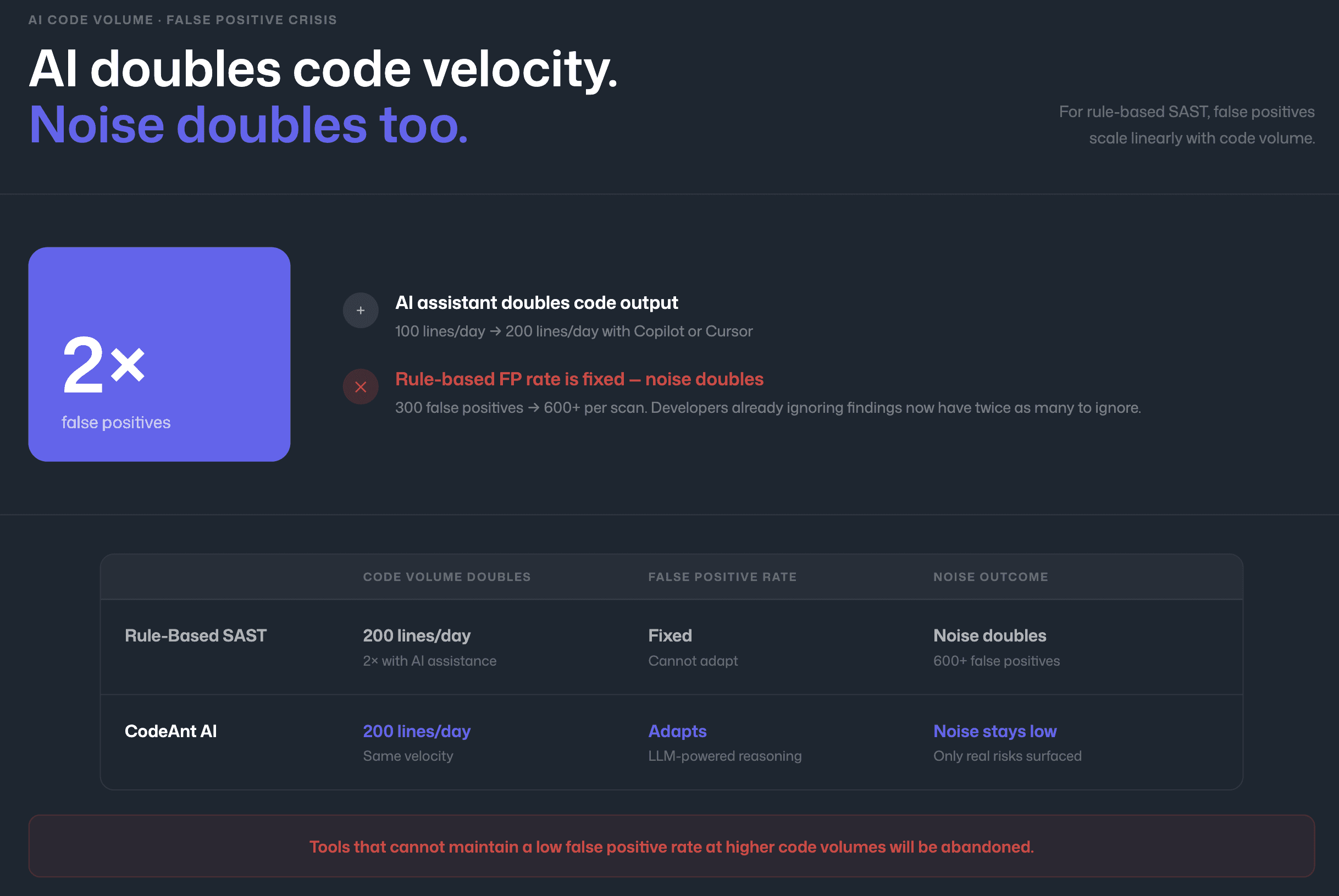 AI assistants dramatically increase code velocity. A developer using Copilot or Cursor produces more code per hour, which means more code entering pull requests per day, which means more findings per scan. For rule-based SAST tools with high false positive rates, this increased volume is catastrophic, the number of false positives scales linearly with code volume, and alert fatigue escalates proportionally.